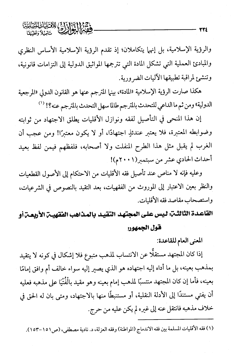 إن هذا المنحى في التأصيل لفقه ونوازل الأقليات يطلق الاجتهاد من ثوابته وضوابطه المعتبرة، فلا يعتبر عندئذٍ اجتهادًا، أو لا يكون معتبرًا! ومن عجب أن الغرب لم يقبل مثل هذا الطرح المنفلت ولا أصحابه، فلفظهم فيمن لفظ بعيد أحداث الحادي عشر من سبتمبر (2001 م)!