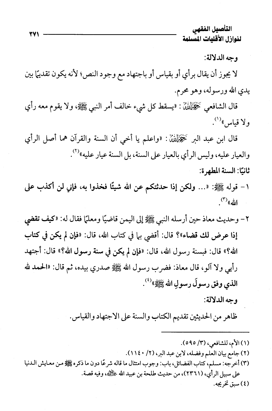 2 - وحديث معاذ حين أرسله النبي - صلى الله عليه وسلم - إلى اليمن قاضيًا ومعلمًا فقال له: "كيف تقضي إذا عرض لك قضاء"؟ قال: أقضي بما في كتاب الله، قال: "فإن لم يكن في كتاب الله؟ " قال: فبسنة رسول الله، قال: "فإن لم يكن في سنة رسول الله؟ " قال: أجتهد رأيي ولا آلو، قال معاذ: فضرب رسول الله - صلى الله عليه وسلم - صدري بيده، ثم قال: "الحمد لله الذي وفق رسولَ رسولِ الله - صلى الله عليه وسلم -" (¬4).