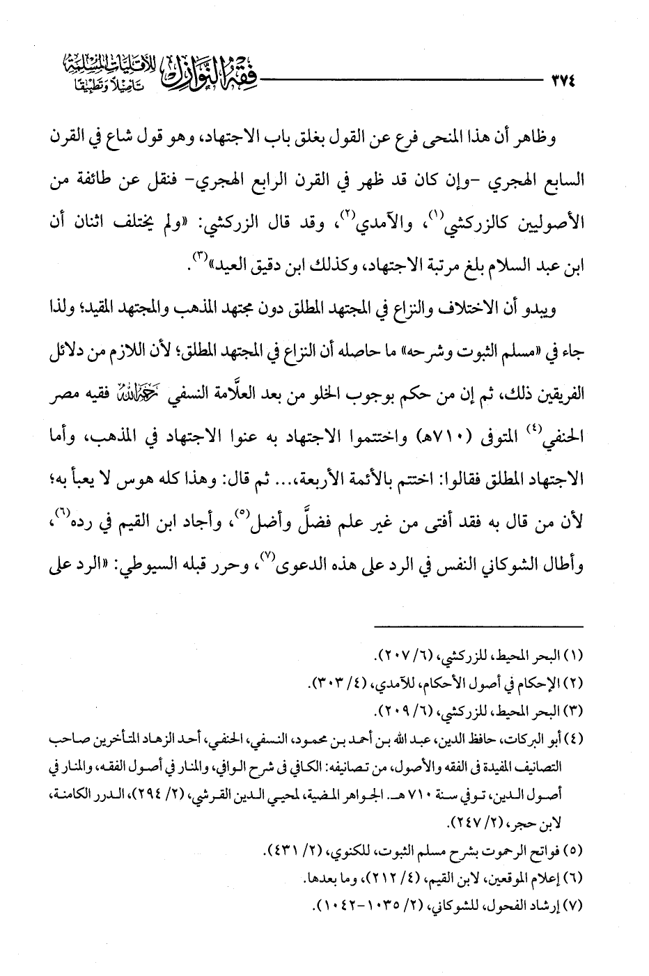 وظاهر أن هذا المنحى فرع عن القول بغلق باب الاجتهاد، وهو قول شاع في القرن السابع الهجري -وإن كان قد ظهر في القرن الرابع الهجري- فنقل عن طائفة من الأصوليين كالزركشي (¬1)، والآمدي (¬2)، وقد قال الزركشي: "ولم يختلف اثنان أن ابن عبد السلام بلغ مرتبة الاجتهاد، وكذلك ابن دقيق العيد" (¬3).