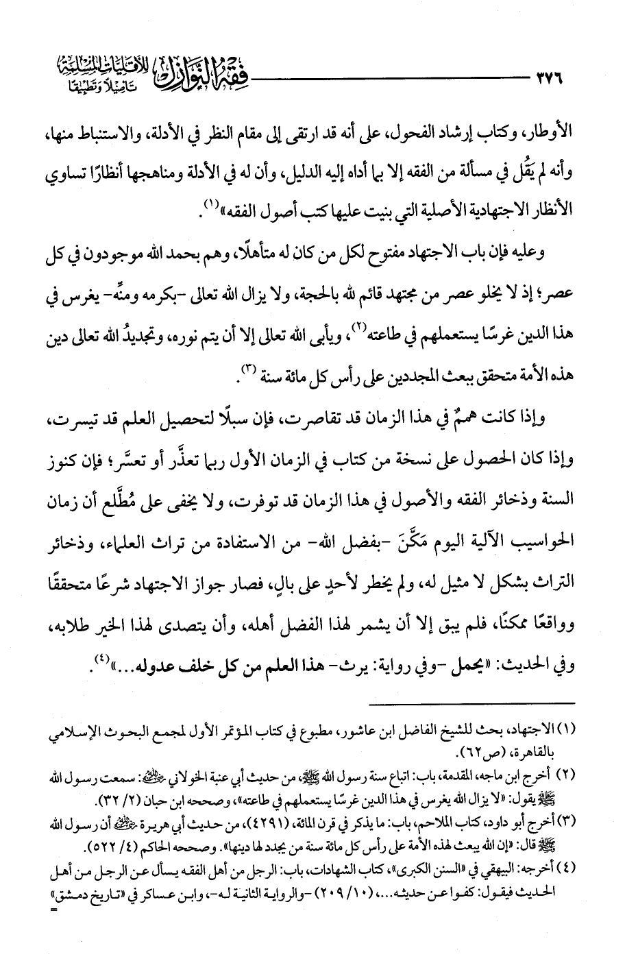 (¬3) أخرج أبو داود، كتاب الملاحم، باب: ما يذكر في قرن المائة، (4291)، من حديث أبي هريرة -رضي الله عنه- أن رسول الله - صلى الله عليه وسلم - قال: "إن الله يبعث لهذه الأمة على رأس كل مائة سنة من يجدد لها دينها". وصححه الحاكم (4/ 522).