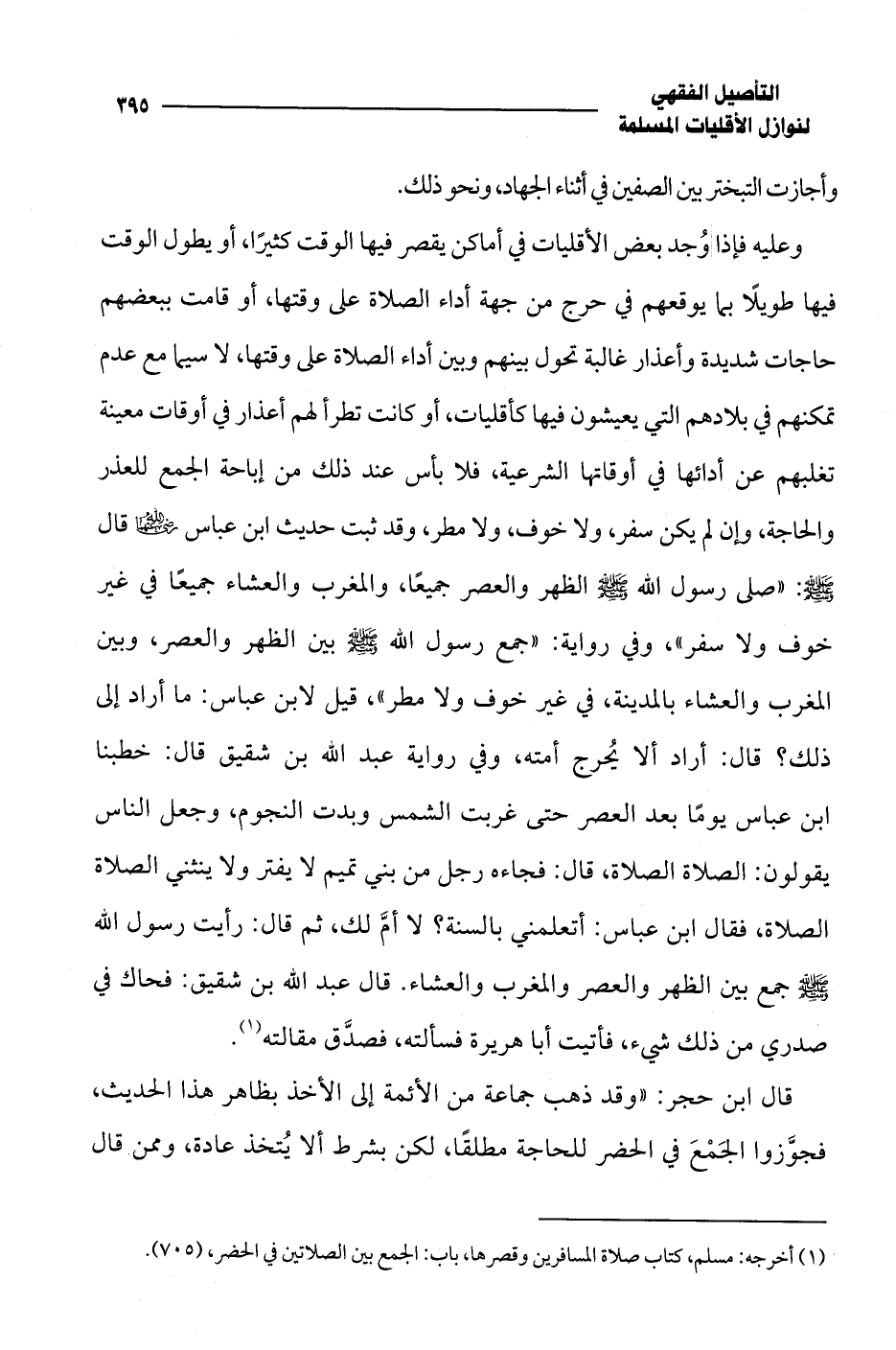 وعليه فإذا وُجد بعض الأقليات في أماكن يقصر فيها الوقت كثيرًا، أو يطول الوقت فيها طويلًا بما يوقعهم في حرج من جهة أداء الصلاة على وقتها، أو قامت ببعضهم حاجات شديدة وأعذار غالبة تحول بينهم وبين أداء الصلاة على وقتها، لا سيما مع عدم تمكنهم في بلادهم التي يعيشون فيها كأقليات، أو كانت تطرأ لهم أعذار في أوقات معينة تغلبهم عن أدائها في أوقاتها الشرعية، فلا بأس عند ذلك من إباحة الجمع للعذر والحاجة، كان لم يكن سفر، ولا خوف، ولا مطر، وقد ثبت حديث ابن عباس -رضي الله عنهما- قال - صلى الله عليه وسلم -: "صلى رسول الله - صلى الله عليه وسلم - الظهر والعصر جميعًا، والمغرب والعشاء جميعًا في غير خوف ولا سفر"، وفي رواية: "جمع رسول الله - صلى الله عليه وسلم - بين الظهر والعصر، وبين المغرب والعشاء بالمدينة، في غير خوف ولا مطر"، قيل لابن عباس: ما أراد إلى ذلك؟ قال: أراد ألا يُحرج أمته، وفي رواية عبد الله بن شقيق قال: خطبنا ابن عباس يومًا بعد العصر حتى غربت الشمس وبدت النجوم، وجعل الناس يقولون: الصلاة الصلاة، قال: فجاءه رجل من بني تميم لا يفتر ولا ينثني الصلاة الصلاة، فقال ابن عباس: أتعلمني بالسنة؟ لا أمَّ لك، ثم قال: رأيت رسول الله - صلى الله عليه وسلم - جمع بين الظهر والعصر والمغرب والعشاء. قال عبد الله بن شقيق: فحاك في صدري من ذلك شيء، فأتيت أبا هريرة فسألته، فصدَّق مقالته (¬1).