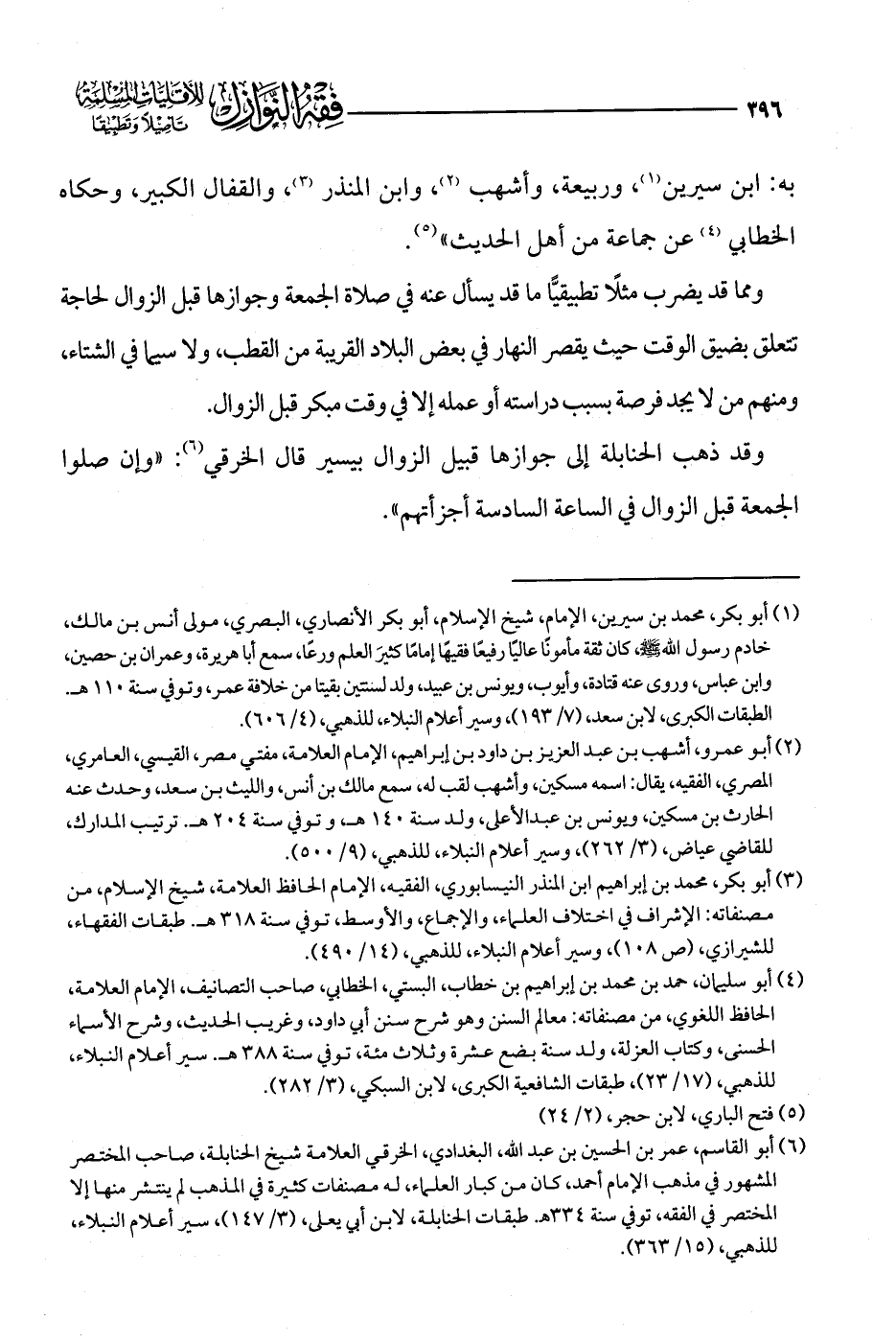 ومما قد يضرب مثلًا تطبيقيًّا ما قد يسأل عنه في صلاة الجمعة وجوازها قبل الزوال لحاجة تتعلق بضيق الوقت حيث يقصر النهار في بعض البلاد القريبة من القطب، ولا سيما في الشتاء، ومنهم من لا يجد فرصة بسبب دراسته أو عمله إلا في وقت مبكر قبل الزوال.