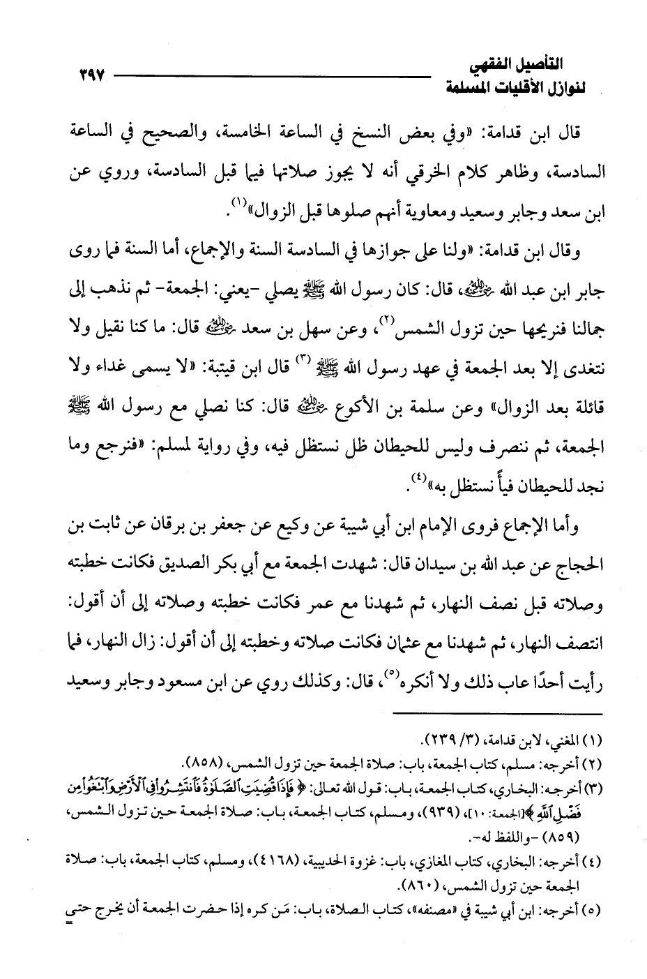 وقال ابن قدامة: "ولنا على جوازها في السادسة السنة والإجماع، أما السنة فما روى جابر ابن عبد الله -رضي الله عنه-، قال: كان رسول الله - صلى الله عليه وسلم - يصلي -يعني: الجمعة- ثم نذهب إلى جمالنا فنريحها حين تزول الشمس (¬2)، وعن سهل بن سعد -رضي الله عنه- قال: ما كنا نقيل ولا نتغدى إلا بعد الجمعة في عهد رسول الله - صلى الله عليه وسلم - (¬3) قال ابن قيتبة: "لا يسمى غداء ولا قائلة بعد الزوال" وعن سلمة بن الأكوع -رضي الله عنه- قال: كنا نصلي مع رسول الله - صلى الله عليه وسلم - الجمعة، ثم ننصرف وليس للحيطان ظل نستظل فيه، وفي رواية لمسلم: "فنرجع وما نجد للحيطان فيأً نستظل به" (¬4).