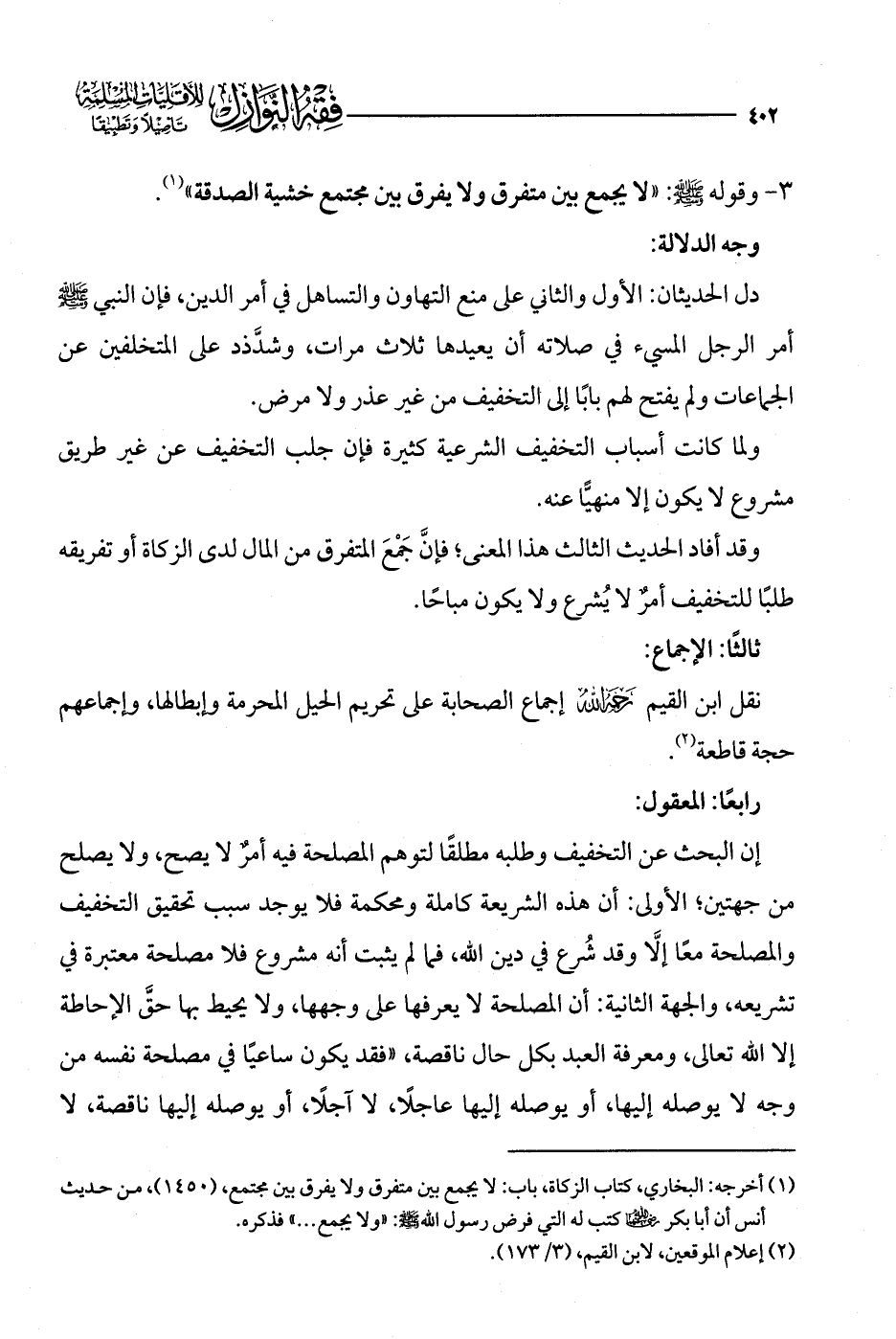 3 - وقوله - صلى الله عليه وسلم -: "لا يجمع بين متفرق ولا يفرق بين مجتمع خشية الصدقة" (¬1).