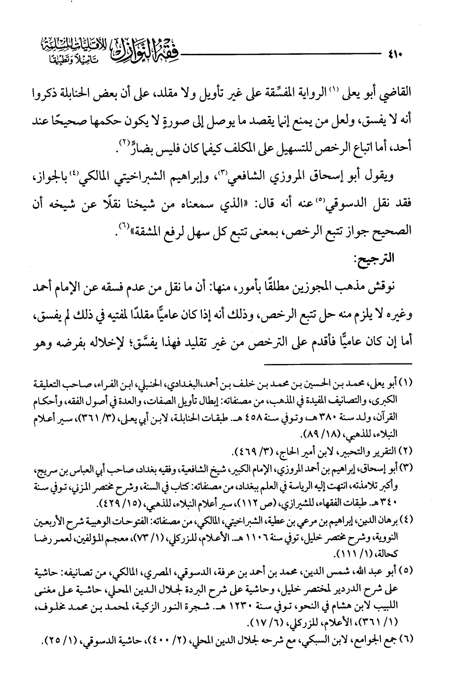 القاضي أبو يعلى (¬1) الرواية المفسِّقة على غير تأويل ولا مقلد، على أن بعض الحنابلة ذكروا أنه لا يفسق، ولعل من يمنع إنما يقصد ما يوصل إلى صورةٍ لا يكون حكمها صحيحًا عند أحد، أما اتباع الرخص للتسهيل على المكلف كيفما كان فليس بضارًّ (¬2).