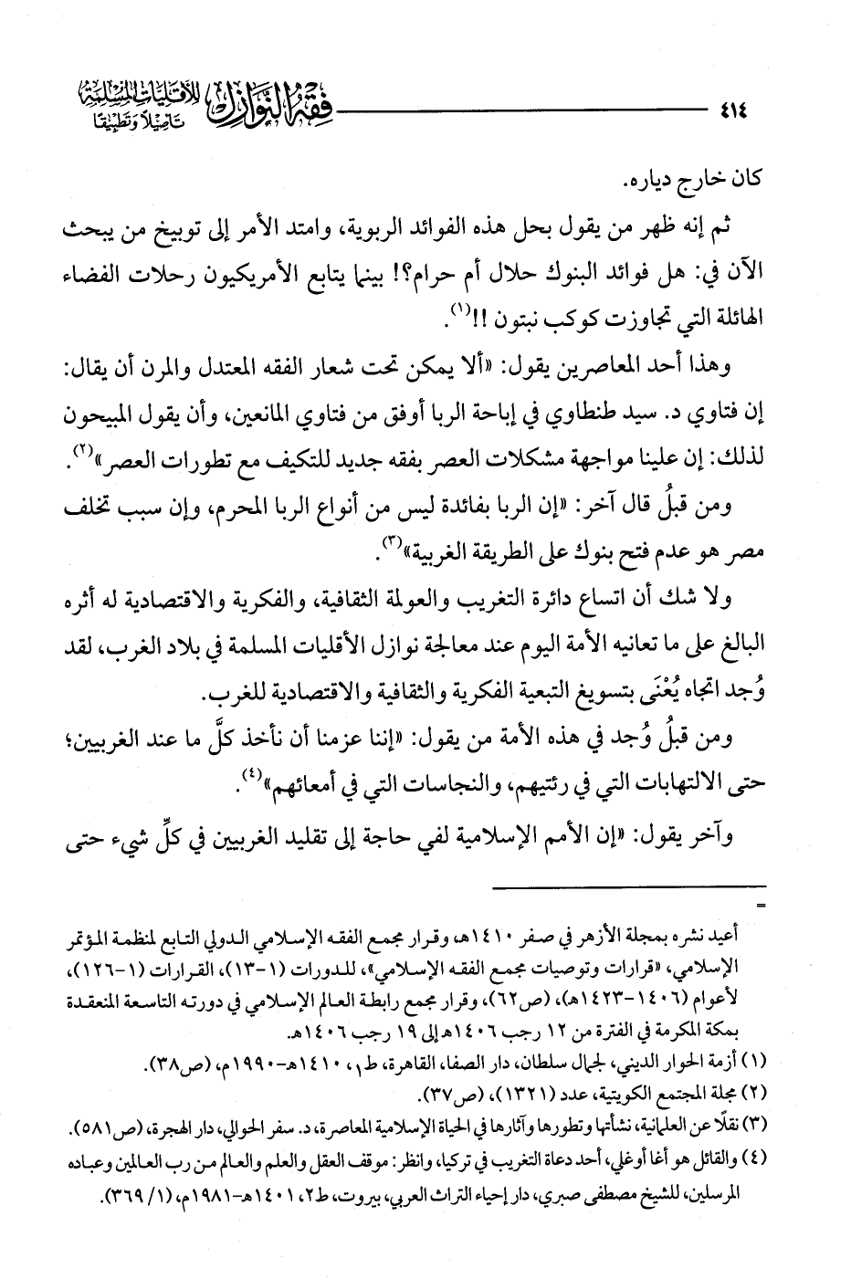وهذا أحد المعاصرين يقول: "ألا يمكن تحت شعار الفقه المعتدل والمرن أن يقال: إن فتاوي د. سيد طنطاوي في إباحة الربا أوفق من فتاوي المانعين، وأن يقول المبيحون لذلك: إن علينا مواجهة مشكلات العصر بفقه جديد للتكيف مع تطورات العصر" (¬2).
