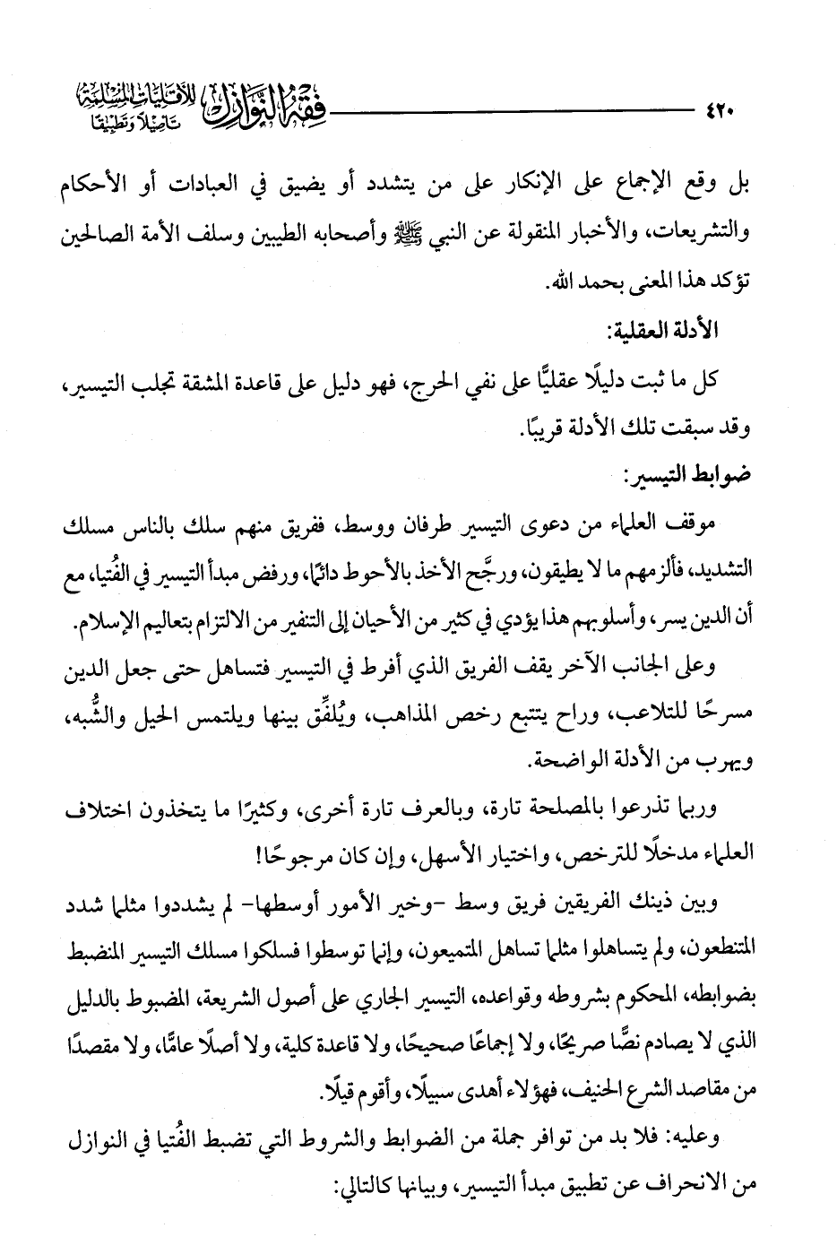 بل وقع الإجماع على الإنكار على من يتشدد أو يضيق في العبادات أو الأحكام والتشريعات، والأخبار المنقولة عن النبي - صلى الله عليه وسلم - وأصحابه الطيبين وسلف الأمة الصالحين تؤكد هذا المعنى بحمد الله.