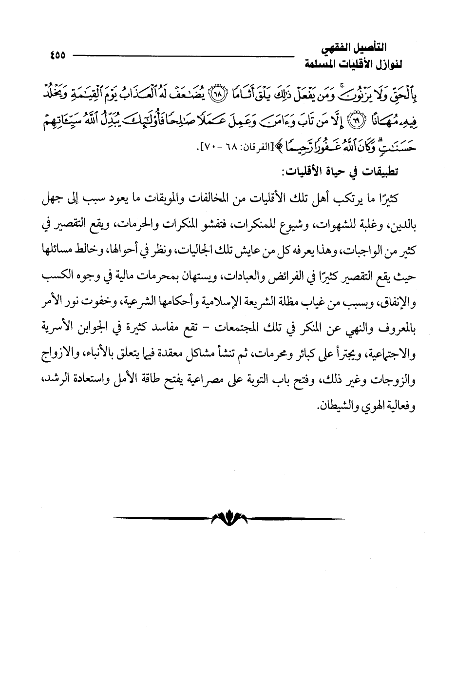 كثيرًا ما يرتكب أهل تلك الأقليات من المخالفات والموبقات ما يعود سبب إلى جهل بالدين، وغلبة للشهوات، وشيوع للمنكرات، فتفشو المنكرات والحرمات، ويقع التقصير في كثير من الواجبات، وهذا يعرفه كل من عايش تلك الجاليات، ونظر في أحوالها، وخالط مسائلها حيث يقع التقصير كثيرًا في الفرائض والعبادات، ويستهان بمحرمات مالية في وجوه الكسب والإنفاق، وبسبب من غياب مظلة الشريعة الإسلامية وأحكامها الشرعية، وخفوت نور الأمر بالمعروف والنهي عن المنكر في تلك المجتمعات -تقع مفاسد كثيرة في الجوابن الأسرية والاجتماعية، ويجترأ على كبائر ومحرمات، ثم تنشأ مشاكل معقدة فيما يتعلق بالأنباء، والازواج والزوجات وغير ذلك، وفتح باب التوبة على مصراعية يفتح طاقة الأمل واستعادة الرشد، وفعالية الهوي والشيطان.
