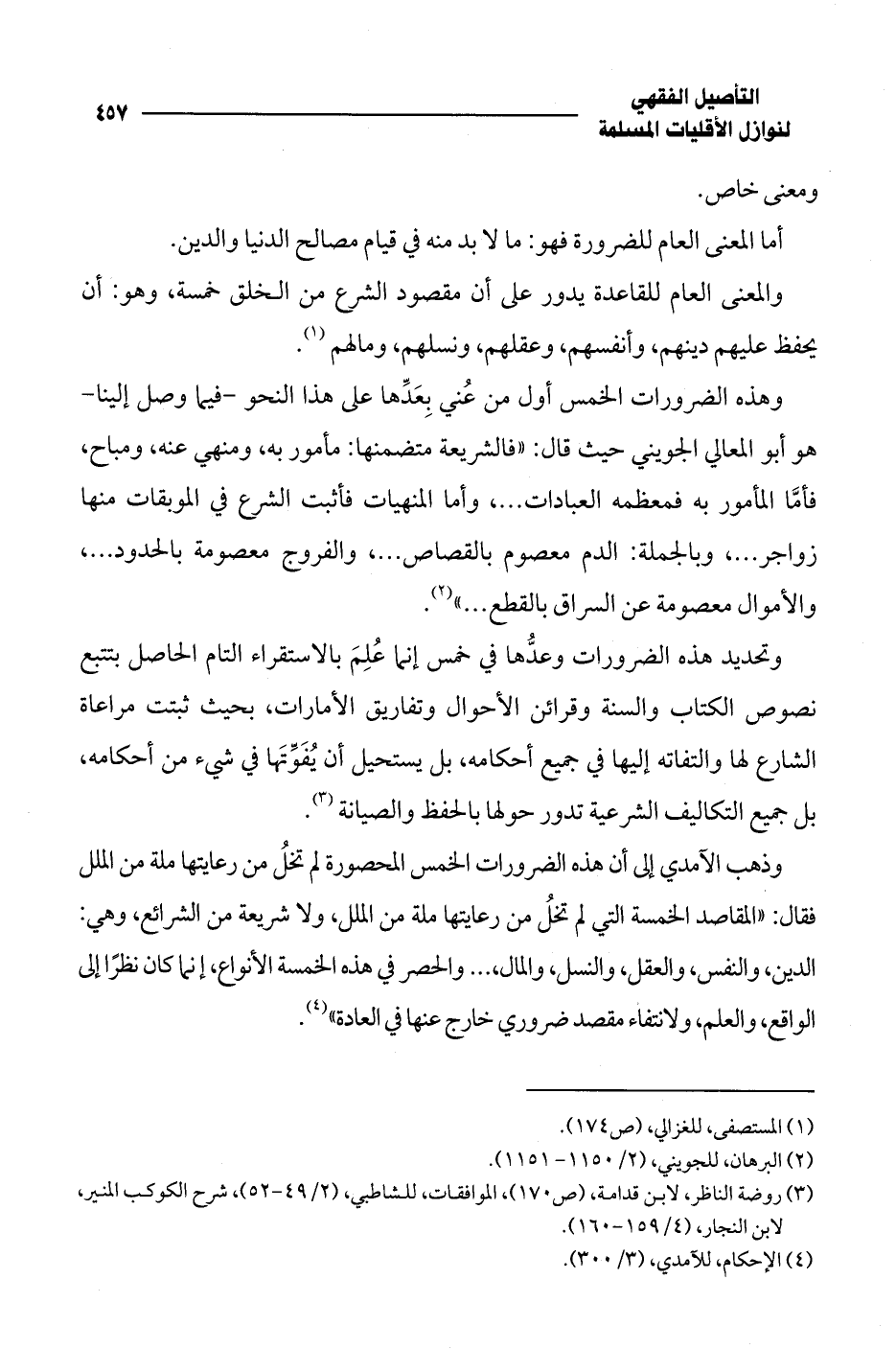 وهذه الضرورات الخمس أول من عُني بِعَدِّها على هذا النحو -فيما وصل إلينا- هو أبو المعالي الجويني حيث قال: "فالشريعة متضمنها: مأمور به، ومنهي عنه، ومباح، فأمَّا المأمور به فمعظمه العبادات. . .، وأما المنهيات فأثبت الشرع في الموبقات منها زواجر. . .، وبالجملة: الدم معصوم بالقصاص. . .، والفروج معصومة بالحدود. . .، والأموال معصومة عن السراق بالقطع. . ." (¬2).
