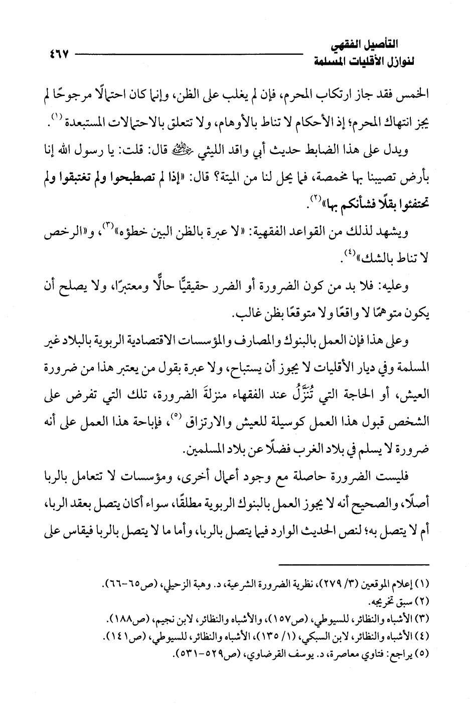 وعلى هذا فإن العمل بالبنوك والمصارف والمؤسسات الاقتصادية الربوية بالبلاد غير المسلمة وفي ديار الأقليات لا يجوز أن يستباح، ولا عبرة بقول من يعتبر هذا من ضرورة العيش، أو الحاجة التي تُنَزَّلُ عند الفقهاء منزلةَ الضرورة، تلك التي تفرض على الشخص قبول هذا العمل كوسيلة للعيش والارتزاق (¬5)، فإباحة هذا العمل على أنه ضرورة لا يسلم في بلاد الغرب فضلًا عن بلاد المسلمين.