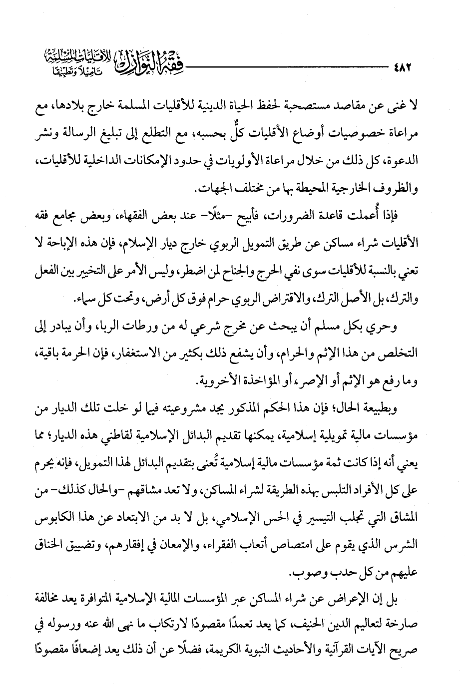 وبطبيعة الحال؛ فإن هذا الحكم المذكور يجد مشروعيته فيما لو خلت تلك الديار من مؤسسات مالية تمويلية إسلامية، يمكنها تقديم البدائل الإسلامية لقاطني هذه الديار؛ مما يعني أنه إذا كانت ثمة مؤسسات مالية إسلامية تُعنى بتقديم البدائل لهذا التمويل، فإنه يحرم على كل الأفراد التلبس بهذه الطريقة لشراء المساكن، ولا تعد مشاقهم -والحال كذلك- من المشاق التي تجلب التيسير في الحس الإسلامي، بل لا بد من الابتعاد عن هذا الكابوس الشرس الذي يقوم على امتصاص أتعاب الفقراء، والإمعان في إفقارهم، وتضييق الخناق عليهم من كل حدب وصوب.
