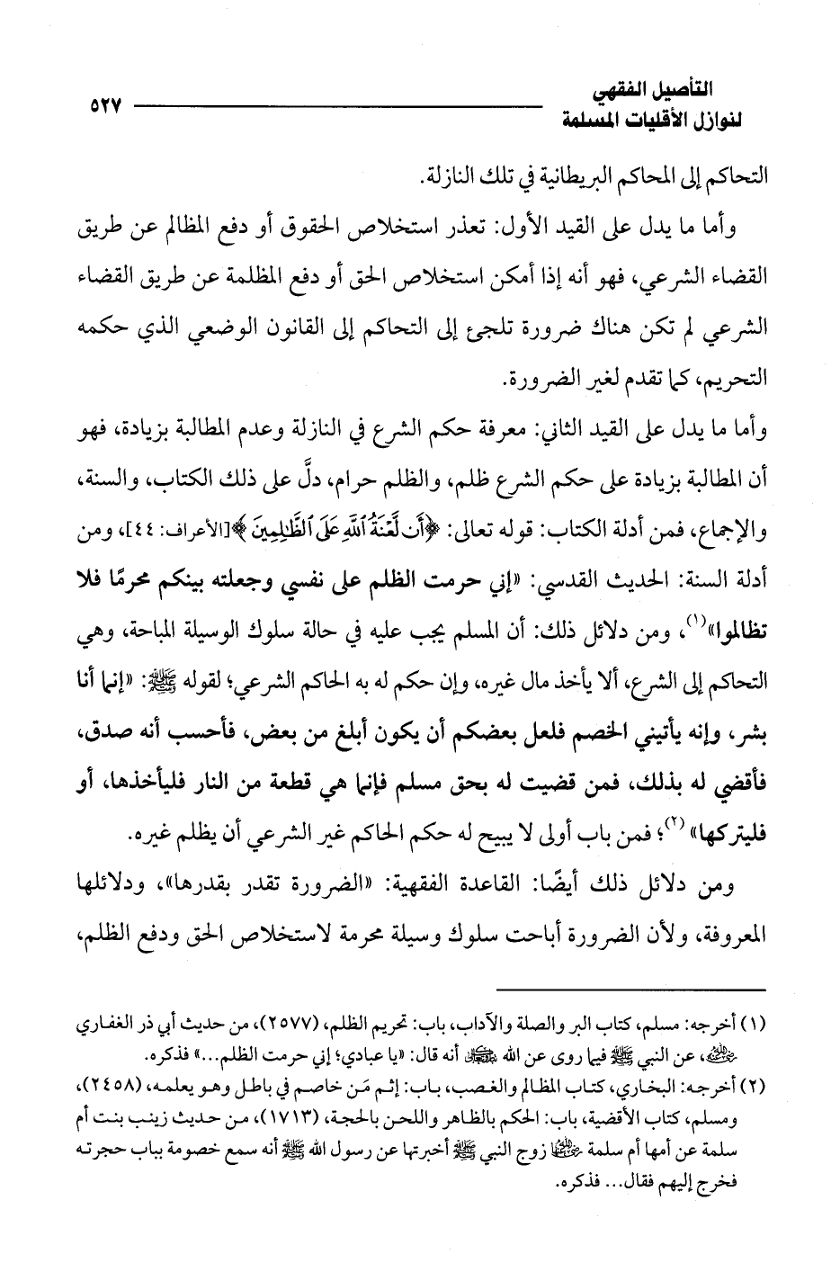 وأما ما يدل على القيد الثاني: معرفة حكم الشرع في النازلة وعدم المطالبة بزيادة، فهو أن المطالبة بزيادة على حكم الشرع ظلم، والظلم حرام، دلَّ على ذلك الكتاب، والسنة، والإجماع، فمن أدلة الكتاب: قوله تعالى: {أَنْ لَعْنَةُ اللَّهِ عَلَى الظَّالِمِينَ} [الأعراف: 44]، ومن أدلة السنة: الحديث القدسي: "إني حرمت الظلم على نفسي وجعلته بينكم محرمًا فلا تظالموا" (¬1)، ومن دلائل ذلك: أن المسلم يجب عليه في حالة سلوك الوسيلة المباحة، وهي التحاكم إلى الشرع، ألا يأخذ مال غيره، وإن حكم له به الحاكم الشرعي؛ لقوله - صلى الله عليه وسلم -: "إنما أنا بشر، وإنه يأتيني الخصم فلعل بعضكم أن يكون أبلغ من بعض، فأحسب أنه صدق، فأقضي له بذلك، فمن قضيت له بحق مسلم فإنما هي قطعة من النار فليأخذها، أو فليتركها" (¬2)؛ فمن باب أولى لا يبيح له حكم الحاكم غير الشرعي أن يظلم غيره.