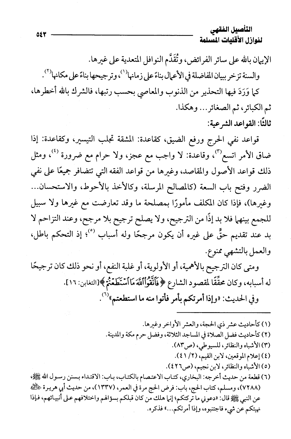 قواعد نفي الحرج ورفع الضيق، كقاعدة: المشقة تجلب التيسير، وكقاعدة: إذا ضاق الأمر اتسع (¬3)، وقاعدة: لا واجب مع عجز، ولا حرام مع ضرورة (¬4)، ومثل ذلك قواعد الأصول والمقاصد، وغيرها من قواعد الفقه التي تتضافر جميعًا على نفي الضرر وفتح باب السعة (كالمصالح المرسلة، وكالأخذ بالأحوط، والاستحسان. . . وغيرها)، فإذا كان المكلف مأمورًا بمصلحة ما وقد تعارضت مع غيرها ولا سبيل للجمع بينهما فلا بد إذًا من الترجيح، ولا يصلح ترجيح بلا مرجح، وعند التزاحم لا بد عند تقديم حقٍّ على غيره أن يكون مرجحًا وله أسباب (¬5)؛ إذ التحكم باطل، والعمل بالتشهي ممنوع.