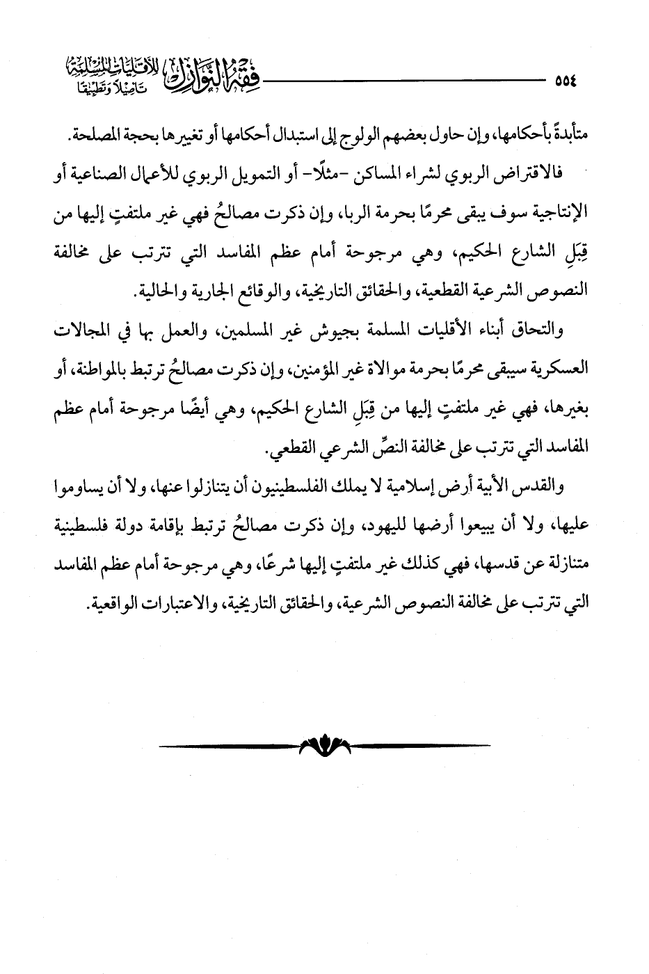 والقدس الأبية أرض إسلامية لا يملك الفلسطينيون أن يتنازلوا عنها، ولا أن يساوموا عليها، ولا أن يبيعوا أرضها لليهود، وإن ذكرت مصالحُ ترتبط بإقامة دولة فلسطينية متنازلة عن قدسها، فهي كذلك غير ملتفتٍ إليها شرعًا، وهي مرجوحة أمام عظم المفاسد التي تترتب على مخالفة النصوص الشرعية، والحقائق التاريخية، والاعتبارات الواقعية.