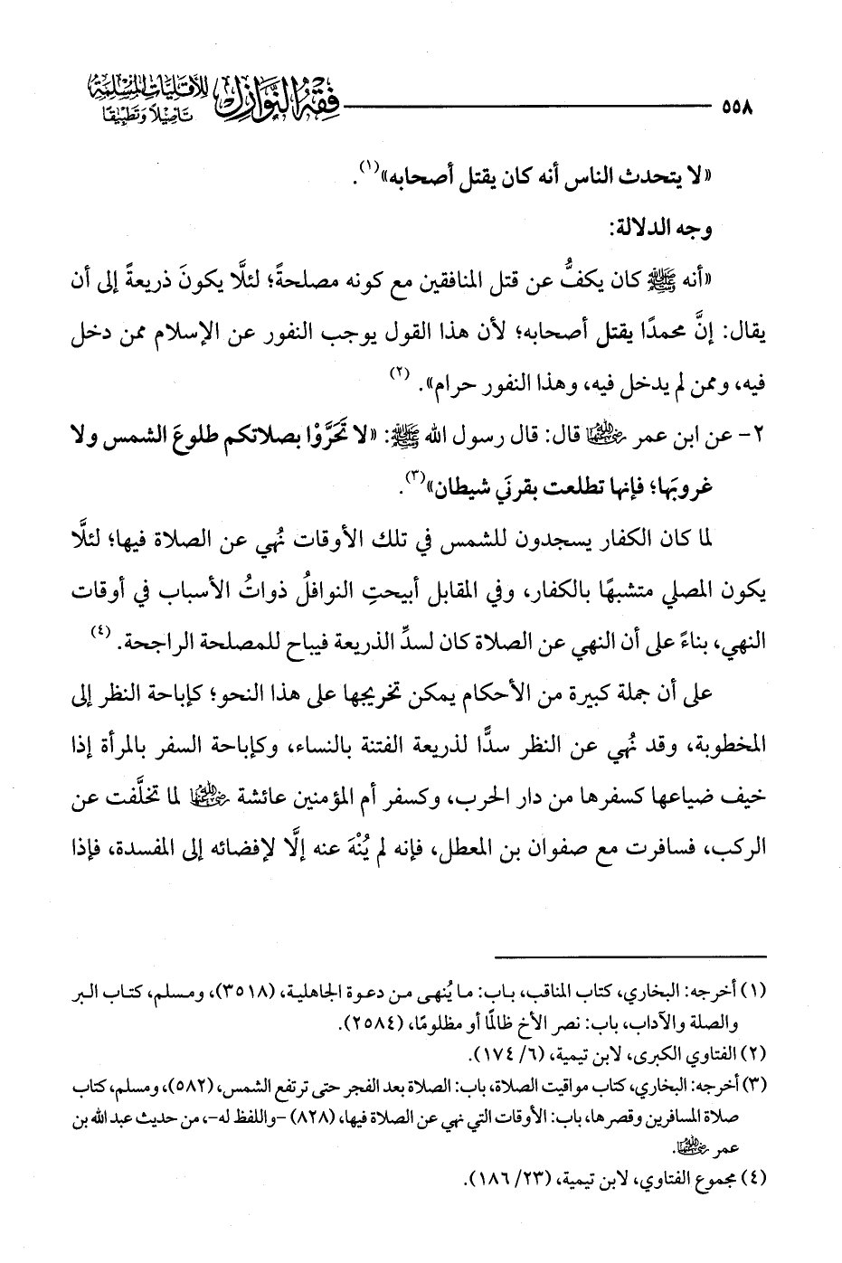 "أنه - صلى الله عليه وسلم - كان يكفُّ عن قتل المنافقين مع كونه مصلحةً؛ لئلَّا يكونَ ذريعةً إلى أن يقال: إنَّ محمدًا يقتل أصحابه؛ لأن هذا القول يوجب النفور عن الإسلام ممن دخل فيه، وممن لم يدخل فيه، وهذا النفور حرام". (¬2)