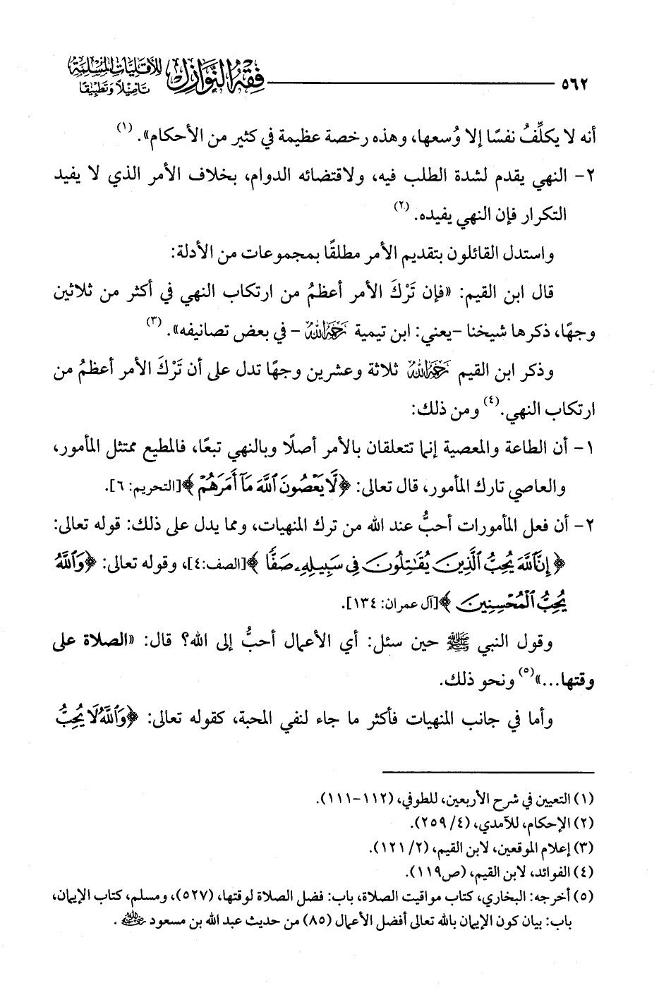 2 - أن فعل المأمورات أحبُّ عند الله من ترك المنهيات، ومما يدل على ذلك: قوله تعالى: {إِنَّ اللَّهَ يُحِبُّ الَّذِينَ يُقَاتِلُونَ فِي سَبِيلِهِ صَفًّا} [الصف: 4]، وقوله تعالى: {وَاللَّهُ يُحِبُّ الْمُحْسِنِينَ} [آل عمران: 134].