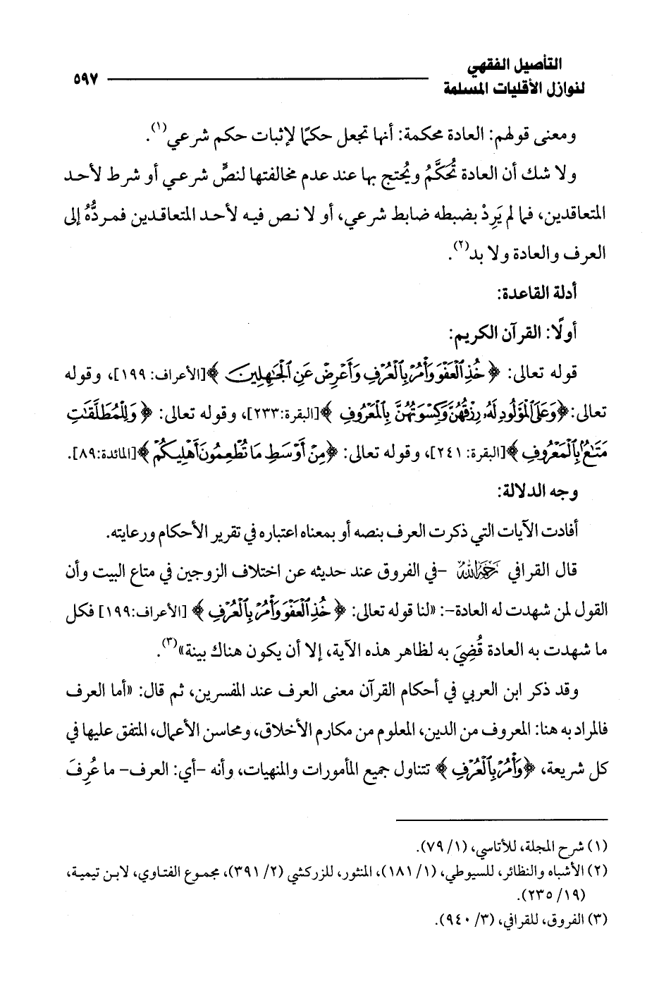 قال القرافي -رحمه الله-في الفروق عند حديثه عن اختلاف الزوجين في متاع البيت وأن القول لمن شهدت له العادة-: "لنا قوله تعالى: {خُذِ الْعَفْوَ وَأْمُرْ بِالْعُرْفِ} [الأعراف: 199] فكل ما شهدت به العادة قُضِيَ به لظاهر هذه الآية، إلا أن يكون هناك بينة" (¬3).
