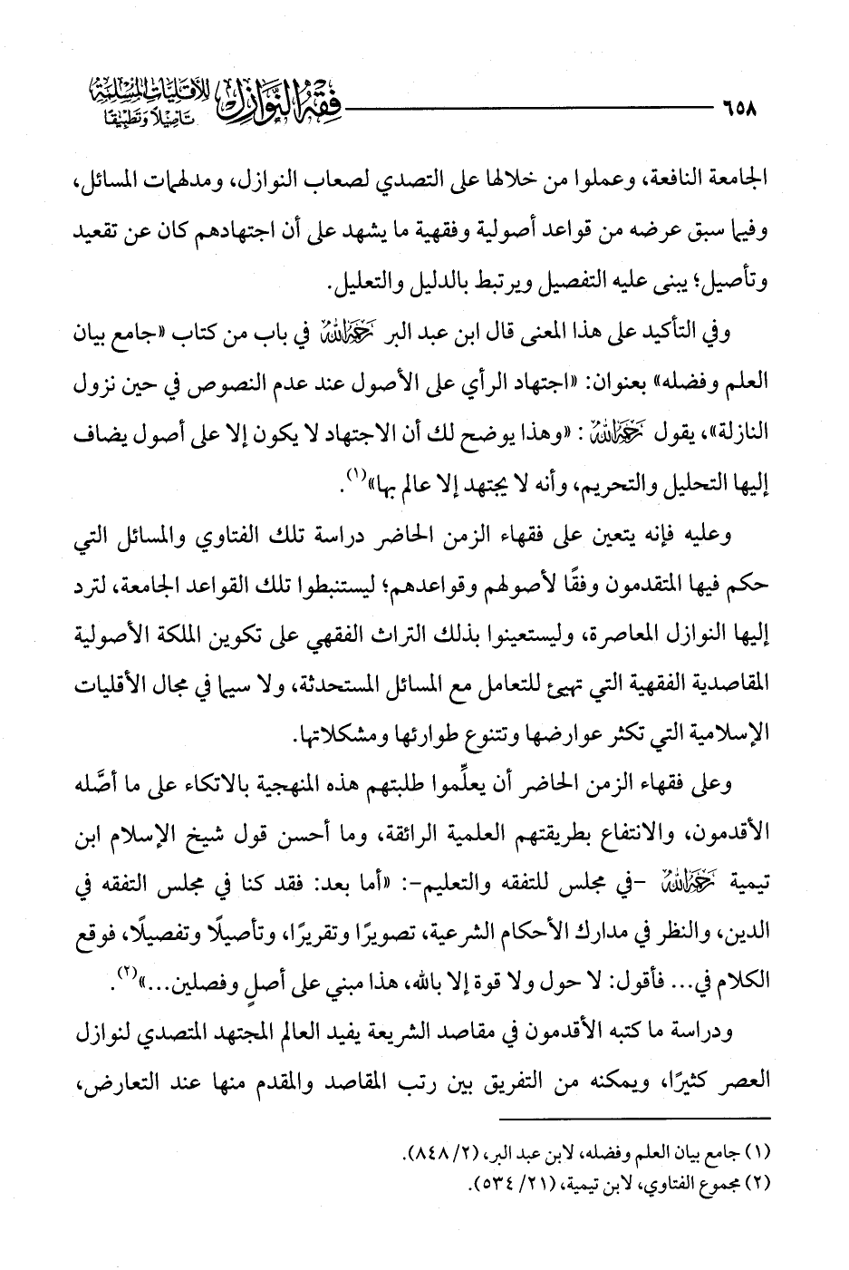وفي التأكيد على هذا المعنى قال ابن عبد البر -رحمه الله- في باب من كتاب "جامع بيان العلم وفضله" بعنوان: "اجتهاد الرأي على الأصول عند عدم النصوص في حين نزول النازلة"، يقول -رحمه الله-: "وهذا يوضح لك أن الاجتهاد لا يكون إلا على أصول يضاف إليها التحليل والتحريم، وأنه لا يجتهد إلا عالم بها" (¬1).