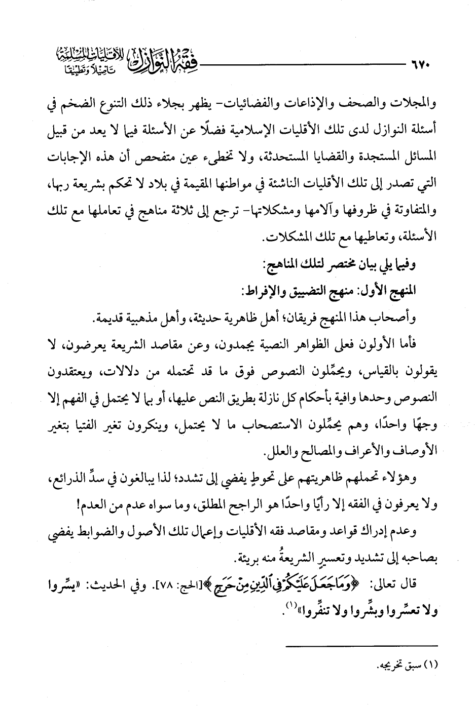 والمجلات والصحف والإذاعات والفضائيات -يظهر بجلاء ذلك التنوع الضخم في أسئلة النوازل لدى تلك الأقليات الإسلامية فضلًا عن الأسئلة فيما لا يعد من قبيل المسائل المستجدة والقضايا المستحدثة، ولا تخطئ عين متفحص أن هذه الإجابات التي تصدر إلى تلك الأقليات الناشئة في مواطنها المقيمة في بلاد لا تحكم بشريعة ربها، والمتفاوتة في ظروفها وآلامها ومشكلاتها- ترجع إلى ثلاثة مناهج في تعاملها مع تلك الأسئلة، وتعاطيها مع تلك المشكلات.