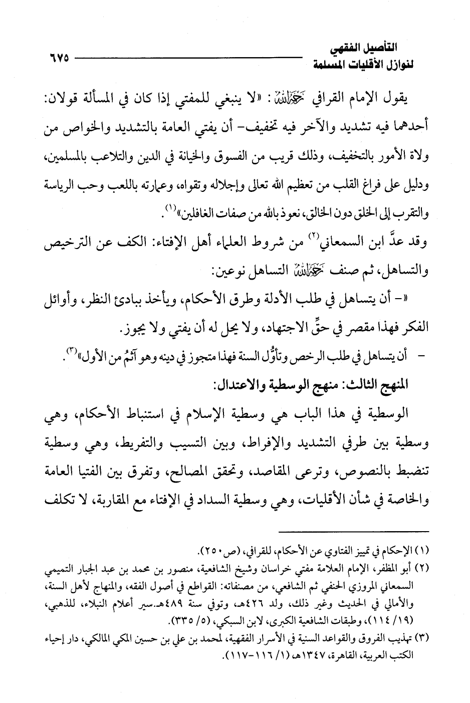 يقول الإمام القرافي -رحمه الله-: "لا ينبغي للمفتي إذا كان في المسألة قولان: