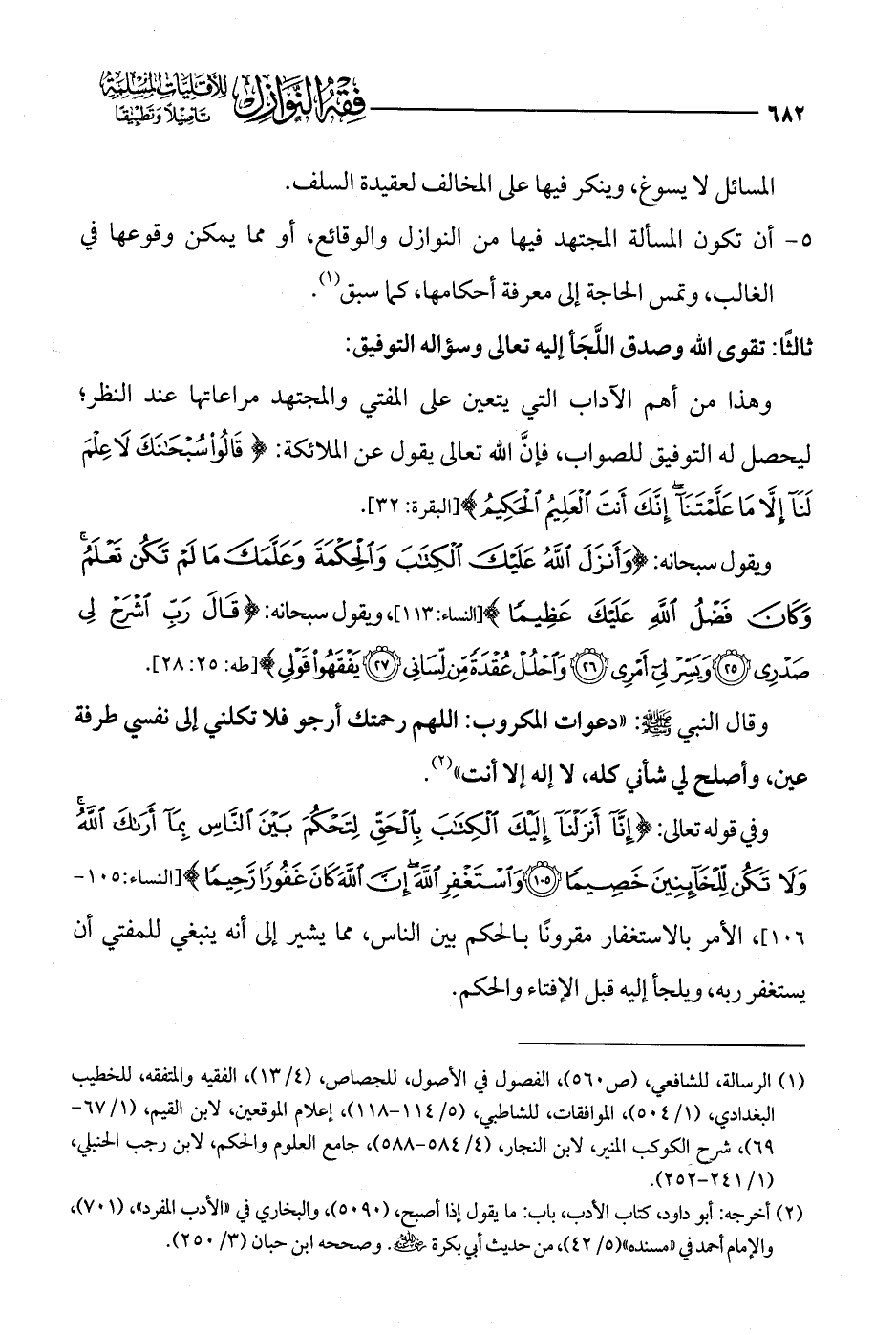 وفي قوله تعالى: {إِنَّا أَنْزَلْنَا إِلَيْكَ الْكِتَابَ بِالْحَقِّ لِتَحْكُمَ بَيْنَ النَّاسِ بِمَا أَرَاكَ اللَّهُ وَلَا تَكُنْ لِلْخَائِنِينَ خَصِيمًا (105) وَاسْتَغْفِرِ اللَّهَ إِنَّ اللَّهَ كَانَ غَفُورًا رَحِيمًا} [النساء: 105 - 106]، الأمر بالاستغفار مقرونًا بالحكم بين الناس، مما يشير إلى أنه ينبغي للمفتي أن يستغفر ربه، ويلجأ إليه قبل الإفتاء والحكم.