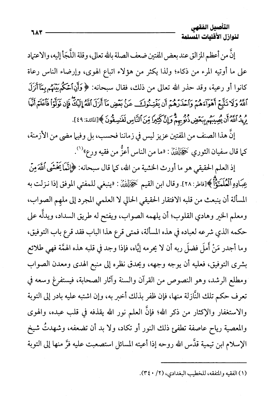 إذ العلم الحقيقي هو ما أورث الخشية من الله، كما قال سبحانه: {إِنَّمَا يَخْشَى اللَّهَ مِنْ عِبَادِهِ الْعُلَمَاءُ} [فاطر: 28]. وقال ابن القيم -رحمه الله-: "ينبغي للمفتي الموفق إذا نزلت به المسألة أن ينبعث من قلبه الافتقار الحقيقي الحالي لا العلمي المجرد إلى ملهِم الصواب، ومعلم الخير وهادي القلوب؛ أن يلهمه الصواب، ويفتح له طريق السداد، ويدلَّه على حكمه الذي شرعه لعباده في هذه المسألة، فمتى قرع هذا الباب فقد قرع باب التوفيق، وما أجدر مَنْ أَملَ فضلَ ربه أن لا يحرمه إيَّاه، فإذا وجد في قلبه هذه الهمَّة فهي طلائع بشرى التوفيق، فعليه أن يوجه وجهه، ويحدق نظره إلى منبع الهدى ومعدن الصواب ومطلع الرشد، وهو النصوص من القرآن والسنة وآثار الصحابة، فيستفرغ وسعه في تعرف حكم تلك النَّازلة منها، فإن ظفر بذلك أخبر به، وإن اشتبه عليه بادر إلى التوبة والاستغفار والإكثار من ذكر الله؛ فإنَّ العلم نور الله يقذفه في قلب عبده، والهوى والمعصية رياح عاصفة تطفئ ذلك النور أو تكاد، ولا بد أن تضعفه، وشهدتُ شيخ الإسلام ابن تيمية قدَّس الله روحه إذا أعيته المسائل استصعبت عليه فرَّ منها إلى التوبة