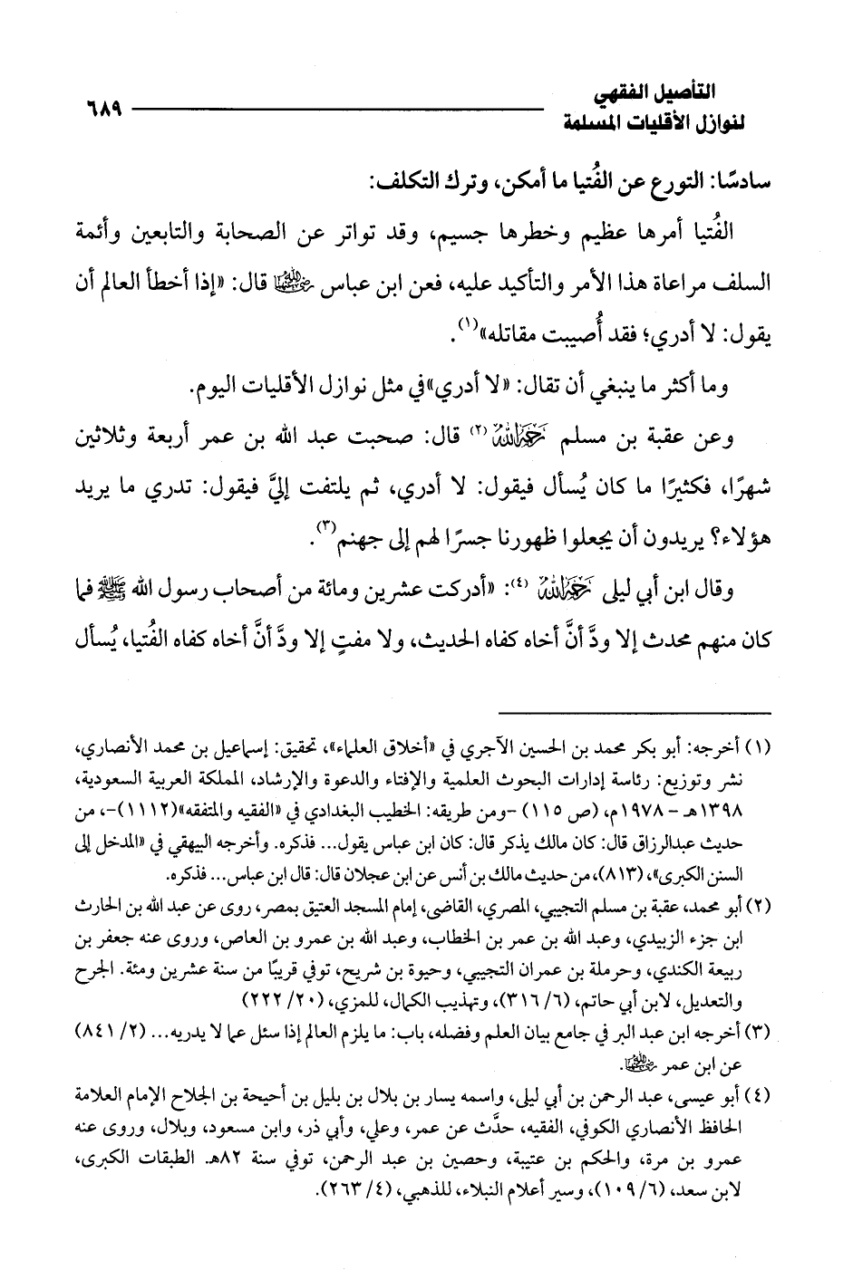الفُتيا أمرها عظيم وخطرها جسيم، وقد تواتر عن الصحابة والتابعين وأئمة السلف مراعاة هذا الأمر والتأكيد عليه، فعن ابن عباس -رضي الله عنهما- قال: "إذا أخطأ العالم أن يقول: لا أدري؛ فقد أُصيبت مقاتله" (¬1).