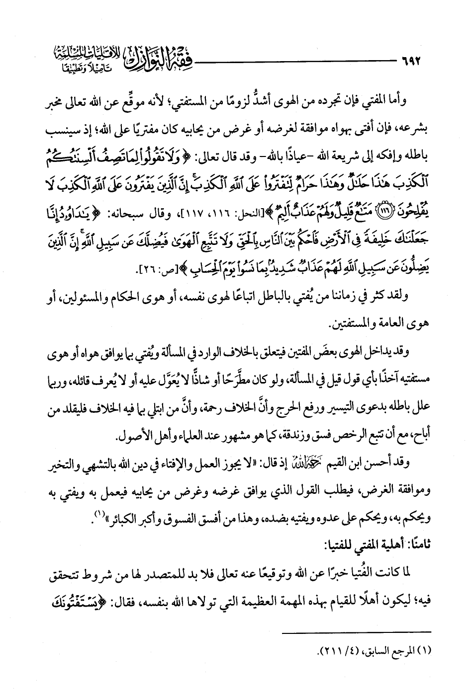 وأما المفتي فإن تجرده من الهوى أشدُّ لزومًا من المستفتي؛ لأنه موقِّع عن الله تعالى مخبر بشرعه، فإن أفتى بهواه موافقة لغرضه أو غرض من يحابيه كان مفتريًا على الله؛ إذ سينسب باطله وإفكه إلى شريعة الله -عياذًا بالله- وقد قال تعالى: {وَلَا تَقُولُوا لِمَا تَصِفُ أَلْسِنَتُكُمُ الْكَذِبَ هَذَا حَلَالٌ وَهَذَا حَرَامٌ لِتَفْتَرُوا عَلَى اللَّهِ الْكَذِبَ إِنَّ الَّذِينَ يَفْتَرُونَ عَلَى اللَّهِ الْكَذِبَ لَا يُفْلِحُونَ (116) مَتَاعٌ قَلِيلٌ وَلَهُمْ عَذَابٌ أَلِيمٌ} [النحل: 116، 117]، وقال سبحانه: {يَادَاوُودُ إِنَّا جَعَلْنَاكَ خَلِيفَةً فِي الْأَرْضِ فَاحْكُمْ بَيْنَ النَّاسِ بِالْحَقِّ وَلَا تَتَّبِعِ الْهَوَى فَيُضِلَّكَ عَنْ سَبِيلِ اللَّهِ إِنَّ الَّذِينَ يَضِلُّونَ عَنْ سَبِيلِ اللَّهِ لَهُمْ عَذَابٌ شَدِيدٌ بِمَا نَسُوا يَوْمَ الْحِسَابِ} [ص: 26].