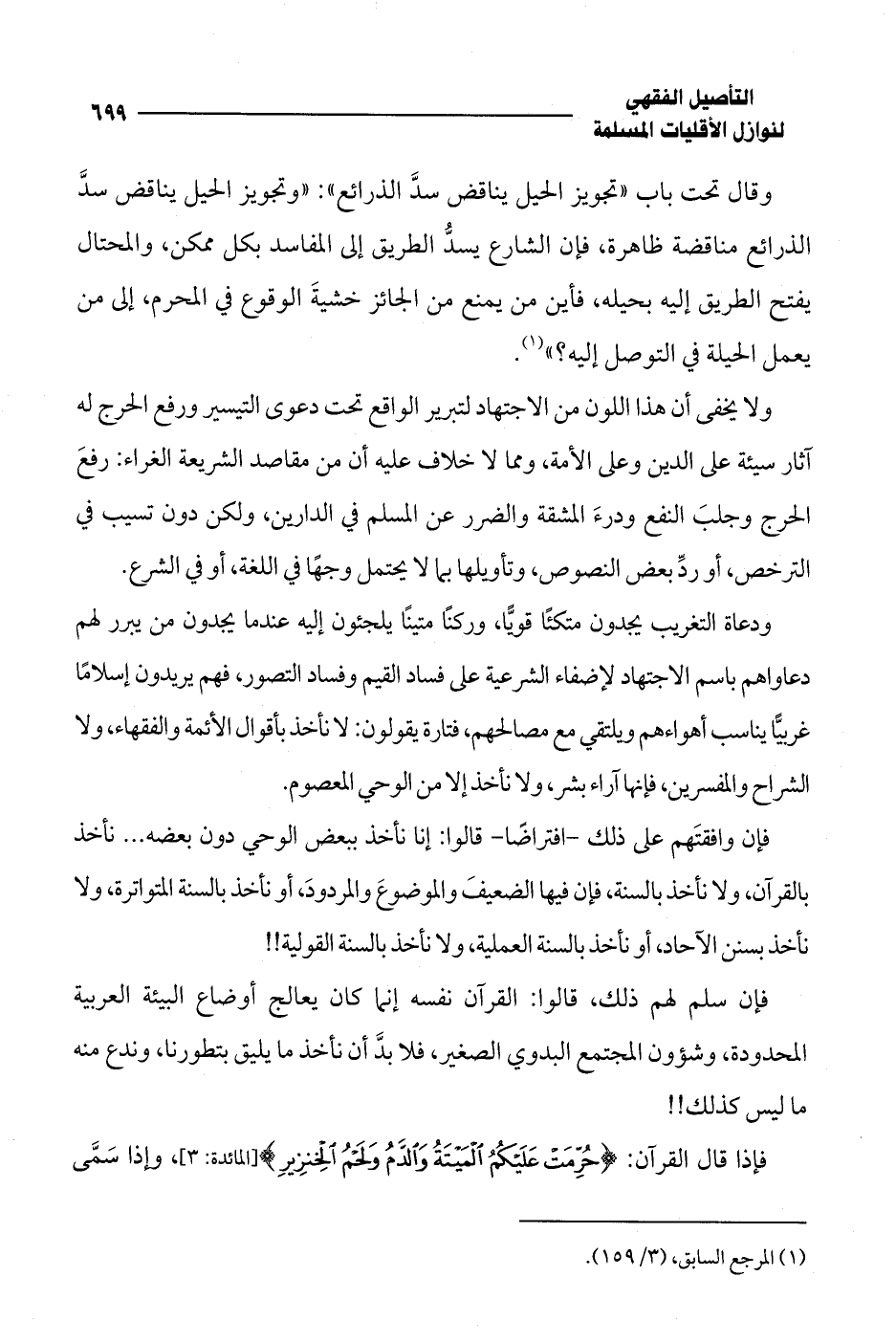 ولا يخفى أن هذا اللون من الاجتهاد لتبرير الواقع تحت دعوى التيسير ورفع الحرج له آثار سيئة على الدين وعلى الأمة، ومما لا خلاف عليه أن من مقاصد الشريعة الغراء: رفعَ الحرج وجلبَ النفع ودرءَ المشقة والضرر عن المسلم في الدارين، ولكن دون تسيب في الترخص، أو ردِّ بعض النصوص، وتأويلها بما لا يحتمل وجهًا في اللغة، أو في الشرع.
