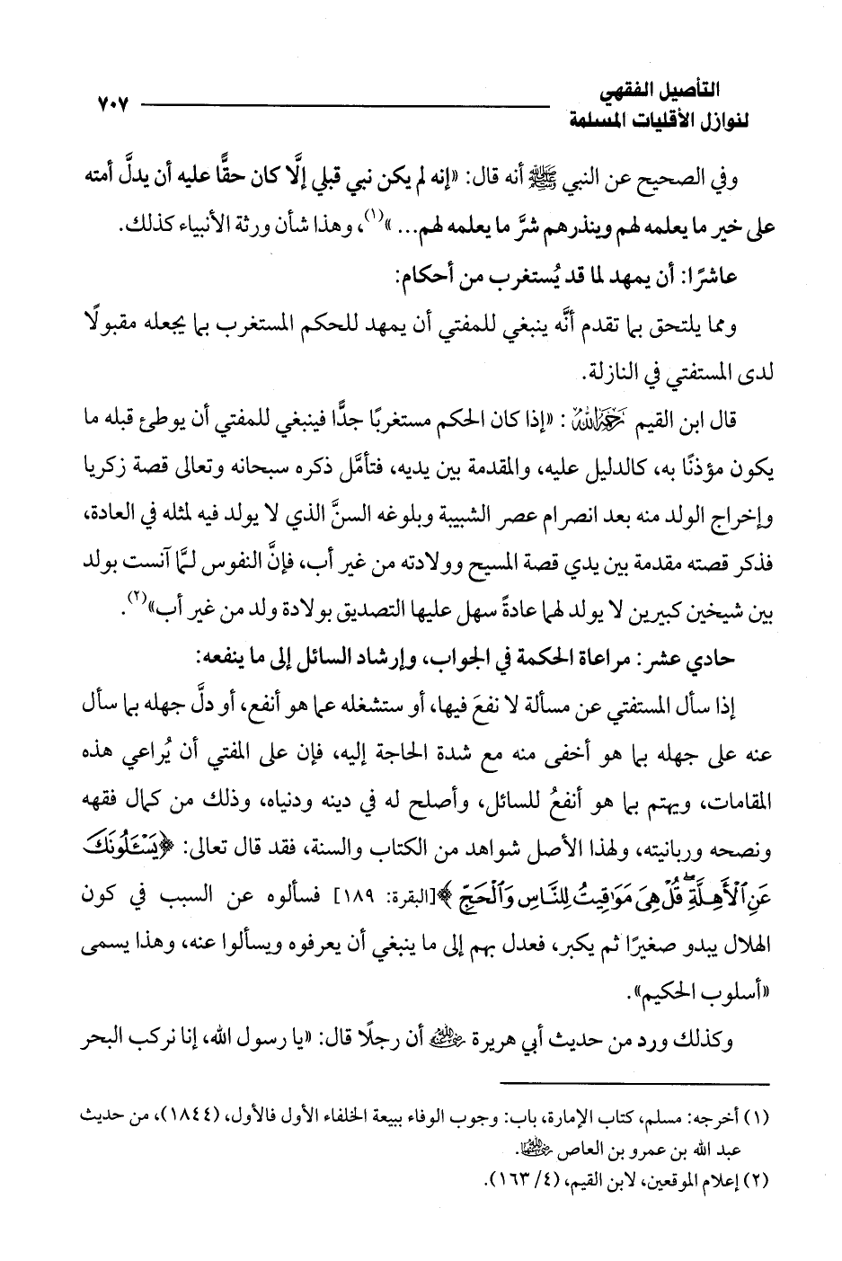 إذا سأل المستفتي عن مسألة لا نفعَ فيها، أو ستشغله عما هو أنفع، أو دلَّ جهله بما سأل عنه على جهله بما هو أخفى منه مع شدة الحاجة إليه، فإن على المفتي أن يُراعي هذه المقامات، ويهتم بما هو أنفعُ للسائل، وأصلح له في دينه ودنياه، وذلك من كمال فقهه ونصحه وربانيته، ولهذا الأصل شواهد من الكتاب والسنة، فقد قال تعالى: {يَسْأَلُونَكَ عَنِ الْأَهِلَّةِ قُلْ هِيَ مَوَاقِيتُ لِلنَّاسِ وَالْحَجِّ} [البقرة: 189] فسألوه عن السبب في كون الهلال يبدو صغيرًا ثم يكبر، فعدل بهم إلى ما ينبغي أن يعرفوه ويسألوا عنه، وهذا يسمى "أسلوب الحكيم".