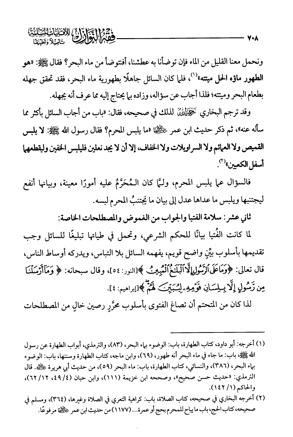 (¬1) أخرجه: أبو داود، كتاب الطهارة، باب: الوضوء بماء البحر، (83)، والترمذي، أبواب الطهارة عن رسول الله - صلى الله عليه وسلم -، باب: ما جاء في ماء البحر أنه طهور، (69)، وابن ماجه، كتاب الطهارة وسننها، باب: الوضوء بماء البحر، (386)، والنسائي، كتاب الطهارة، باب: ماء البحر (59)، من حديث أبي هريرة -رضي الله عنه-. قال الترمذي: "حديث حسن صحيح"، وصححه ابن خزيمة (111)، وابن حبان (4/ 49، 12/ 62)، والحاكم (1/ 142).