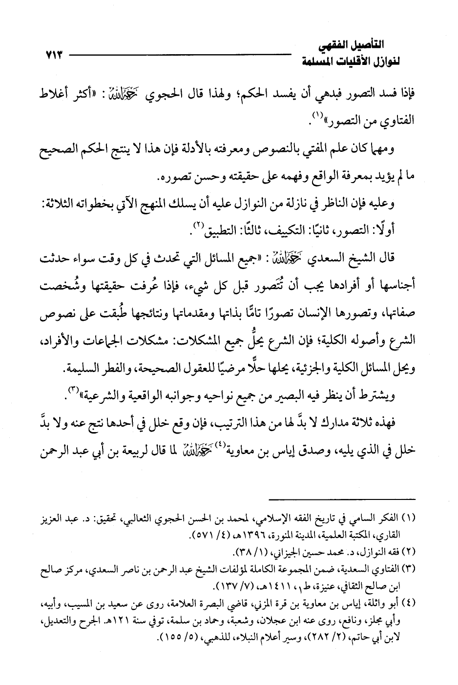 قال الشيخ السعدي -رحمه الله-: "جميع المسائل التي تحدث في كل وقت سواء حدثت أجناسها أو أفرادها يجب أن تُتَصور قبل كل شيء، فإذا عُرفت حقيقتها وشُخصت صفاتها، وتصورها الإنسان تصورًا تامًّا بذاتها ومقدماتها ونتائجها طُبقت على نصوص الشرع وأصوله الكلية؛ فإن الشرع يحلُّ جميع المشكلات: مشكلات الجماعات والأفراد، ويحل المسائل الكلية والجزئية، يحلها حلًّا مرضيًا للعقول الصحيحة، والفطر السليمة.