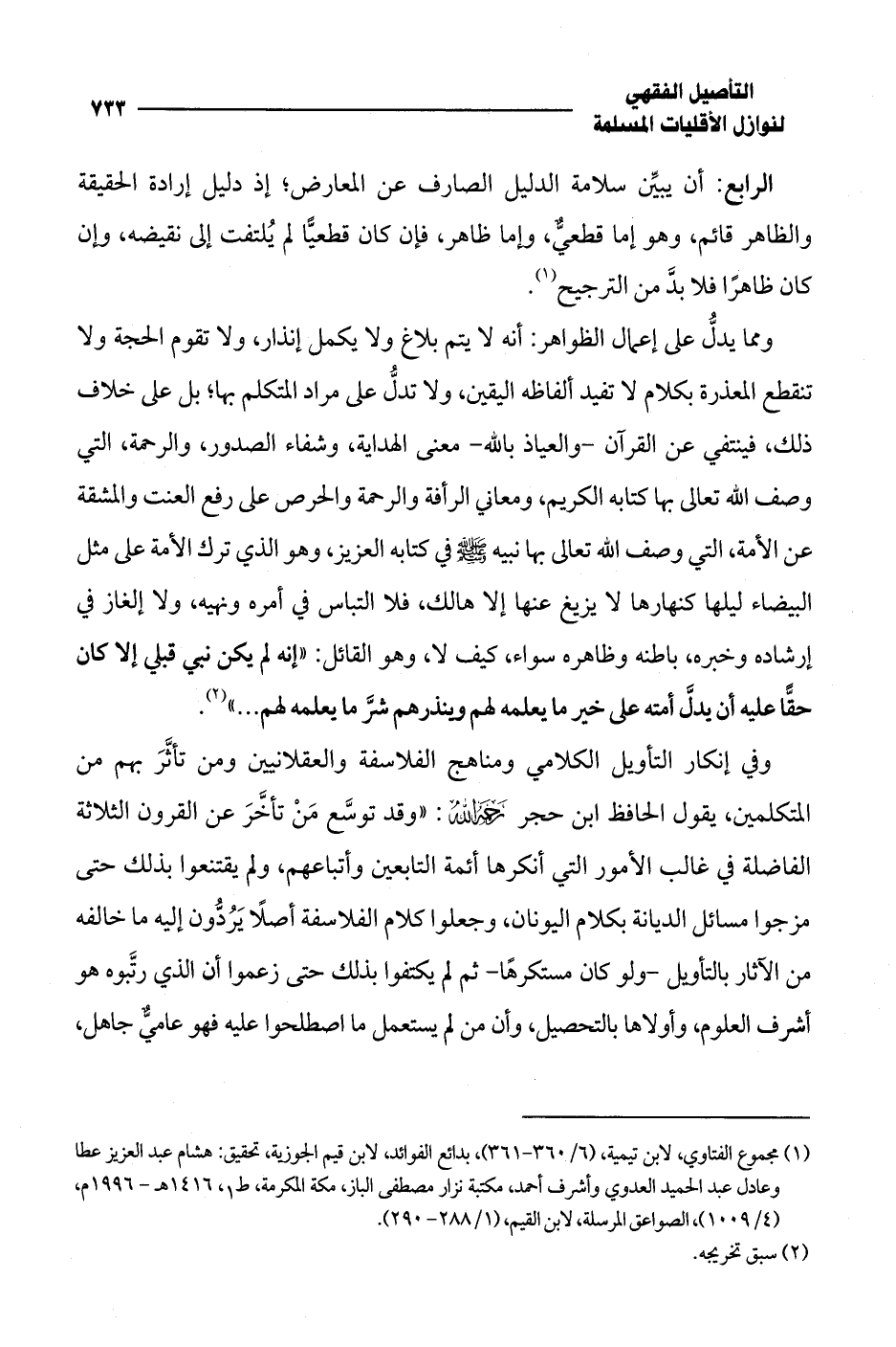 ومما يدلُّ على إعمال الظواهر: أنه لا يتم بلاغ ولا يكمل إنذار، ولا تقوم الحجة ولا تنقطع المعذرة بكلام لا تفيد ألفاظه اليقين، ولا تدلُّ على مراد المتكلم بها؛ بل على خلاف ذلك، فينتفي عن القرآن -والعياذ بالله- معنى الهداية، وشفاء الصدور، والرحمة، التي وصف الله تعالى بها كتابه الكريم، ومعاني الرأفة والرحمة والحرص على رفع العنت والمشقة عن الأمة، التي وصف الله تعالى بها نبيه - صلى الله عليه وسلم - في كتابه العزيز، وهو الذي ترك الأمة على مثل البيضاء ليلها كنهارها لا يزيغ عنها إلا هالك، فلا التباس في أمره ونهيه، ولا إلغاز في إرشاده وخبره، باطنه وظاهره سواء، كيف لا، وهو القائل: "إنه لم يكن نبي قبلي إلا كان حقًّا عليه أن يدلَّ أمته على خير ما يعلمه لهم وبنذرهم شرَّ ما يعلمه لهم. . ." (¬2).