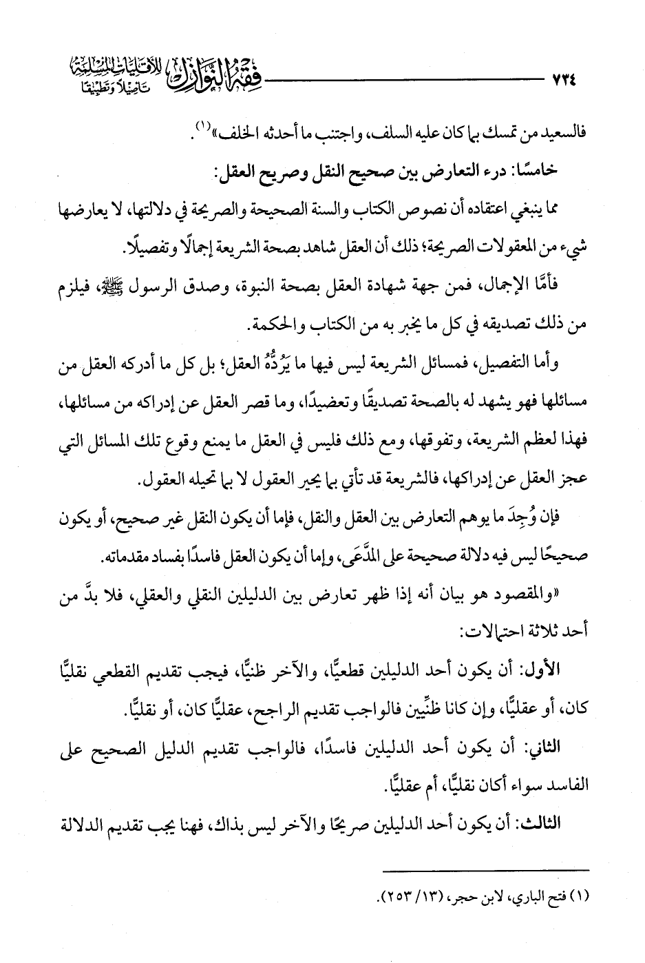 مما ينبغي اعتقاده أن نصوص الكتاب والسنة الصحيحة والصريحة في دلالتها، لا يعارضها شيء من المعقولات الصريحة؛ ذلك أن العقل شاهد بصحة الشريعة إجمالًا وتفصيلًا.
