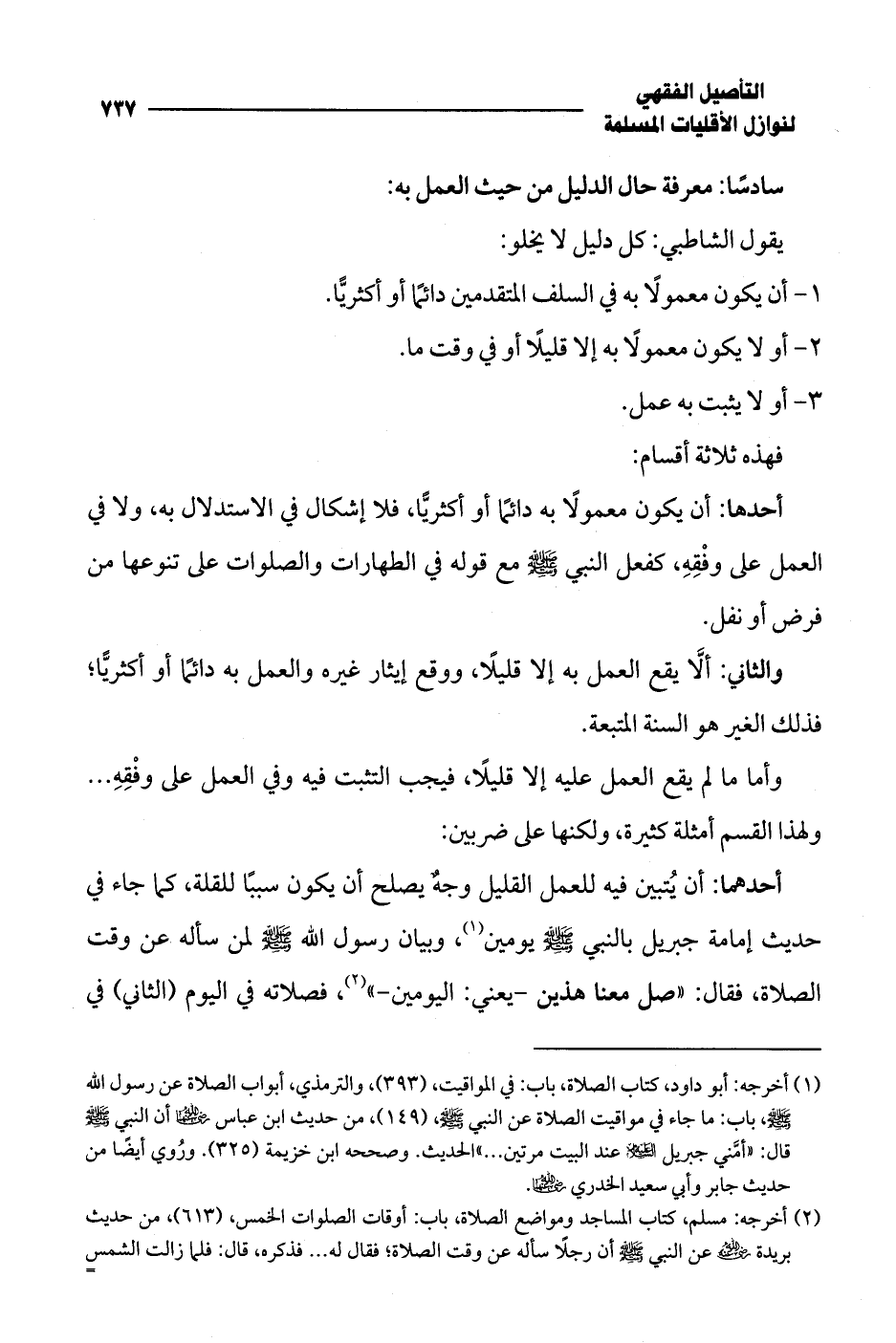 أحدها: أن يكون معمولًا به دائمًا أو أكثريًّا، فلا إشكال في الاستدلال به، ولا في العمل على وفْقِهِ، كفعل النبي - صلى الله عليه وسلم - مع قوله في الطهارات والصلوات على تنوعها من فرض أو نفل.