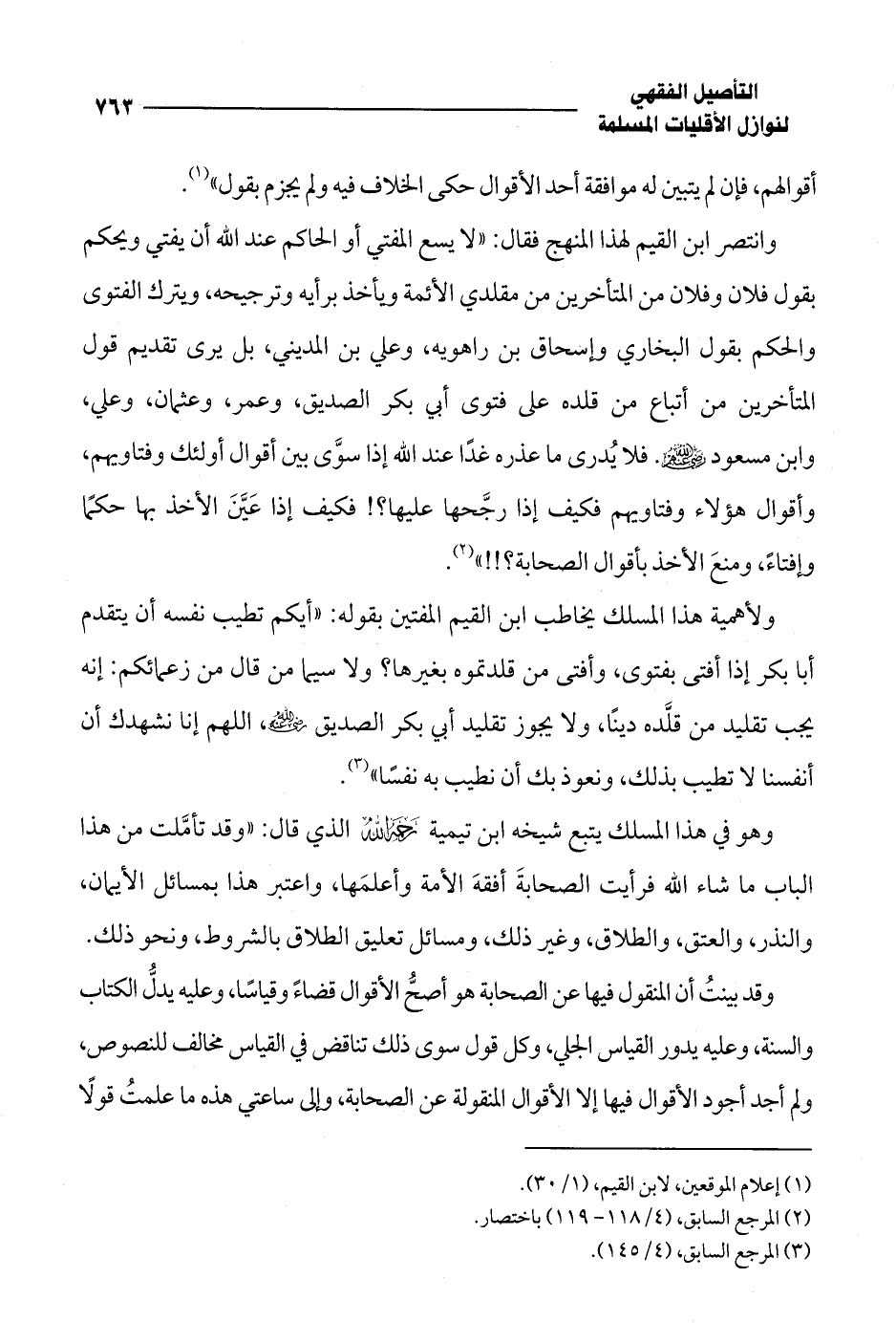 ولأهمية هذا المسلك يخاطب ابن القيم المفتين بقوله: "أيكم تطيب نفسه أن يتقدم أبا بكر إذا أفتى بفتوى، وأفتى من قلدتموه بغيرها؟ ولا سيما من قال من زعمائكم: إنه يجب تقليد من قلَّده دينًا، ولا يجوز تقليد أبي بكر الصديق -رضي الله عنه-، اللهم إنا نشهدك أن أنفسنا لا تطيب بذلك، ونعوذ بك أن نطيب به نفسًا" (¬3).