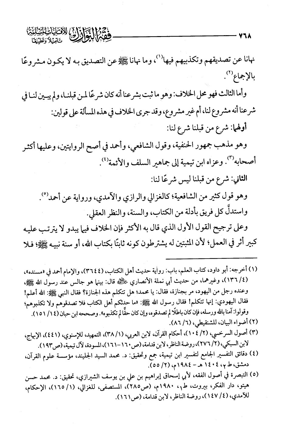 (¬5) التبصرة في أصول الفقه، لأبي إسحاق إبراهيم بن علي بن يوسف الشيرازي، تحقيق: د. محمد حسن هيتو، دار الفكر، بيروت، ط 1، 1980 م، (ص 285)، المستصفى، للغزالي، (1/ 165)، الإحكام، للآمدي، (4/ 147)، روضة الناظر، لابن قدامة، (ص 161).