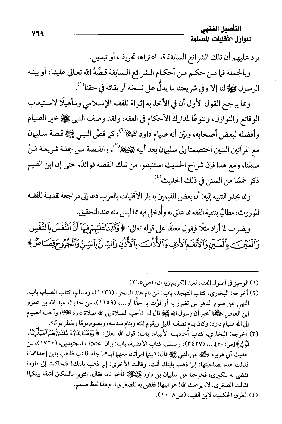 ومما يرجح القول الأول أن في الأخذ به إثراءً للفقه الإسلامي وتأهيلًا لاستيعاب الوقائع والنوازل، وتنوعًا لمدارك الأحكام في الفقه، ولقد وصف النبي - صلى الله عليه وسلم - خير الصيام وأفضله لبعض أصحابه، وبيَّن أنه صيام داود -عليه السلام- (¬2)، كما قصَّ النبي - صلى الله عليه وسلم - قصة سليمان مع المرأتين اللتين اختصمتا إلى سليمان بعد أبيه -عليهما السلام- (¬3)، والقصة من جملة شريعة مَنْ سبقنا، ومع هذا فإن شراح الحديث استنبطوا من تلك القصة فوائدَ، حتى إن ابن القيم ذكر خمسًا من السنن في ذلك الحديث (¬4).