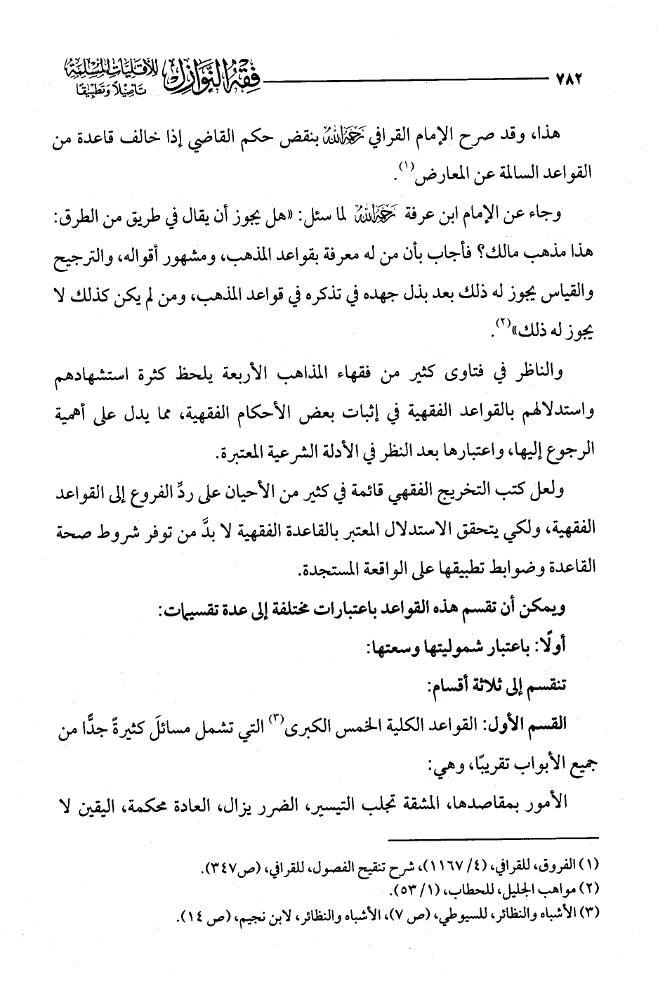 القسم الأول: القواعد الكلية الخمس الكبرى (¬3) التي تشمل مسائلَ كثيرةً جدًّا من جميع الأبواب تقريبًا، وهي:
