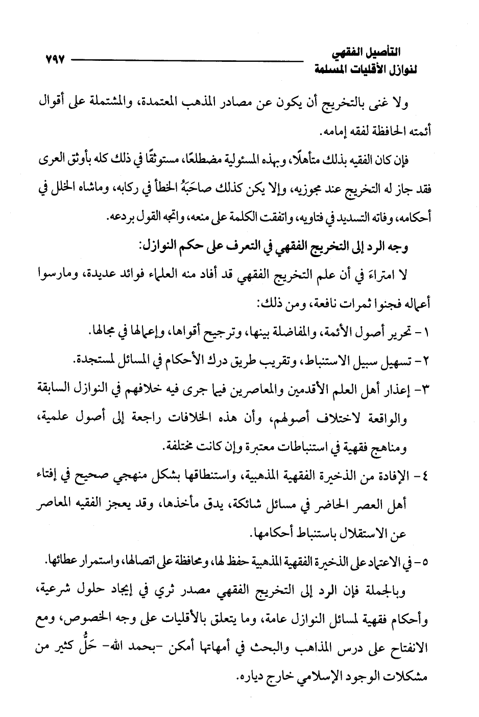 وبالجملة فإن الرد إلى التخريج الفقهي مصدر ثري في إيجاد حلول شرعية، وأحكام فقهية لمسائل النوازل عامة، وما يتعلق بالأقليات على وجه الخصوص، ومع الانفتاح على درس المذاهب والبحث في أمهاتها أمكن -بحمد الله- حَلُّ كثير من مشكلات الوجود الإسلامي خارج دياره.