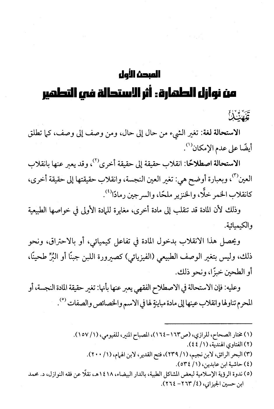 وعليه: فإن الاستحالة في الاصطلاح الفقهي يعبر عنها بأنها: تغير حقيقة المادة النجسة، أو المحرم تناولها وانقلاب عينها إلى مادة مباينةٍ لها في الاسم والخصائص والصفات (¬5).