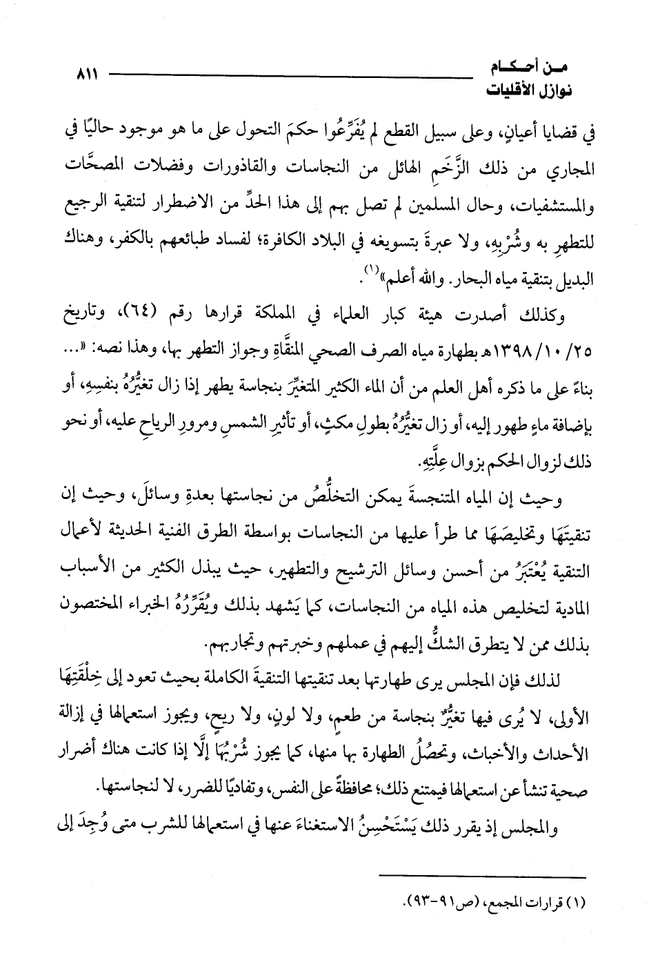 وكذلك أصدرت هيئة كبار العلماء في المملكة قرارها رقم (64)، وتاريخ 25/ 10/ 1398 هـ بطهارة مياه الصرف الصحي المنقَّاةِ وجواز التطهر بها، وهذا نصه: ". . . بناءً على ما ذكره أهل العلم من أن الماء الكثير المتغيِّرَ بنجاسة يطهر إذا زال تغيُّرُهُ بنفسِهِ، أو بإضافة ماءٍ طهور إليه، أو زال تغيُّرُهُ بطولِ مكثٍ، أو تأثيرِ الشمسِ ومرورِ الرياحِ عليه، أو نحو ذلك لزوال الحكم بزوال عِلَّتِهِ.