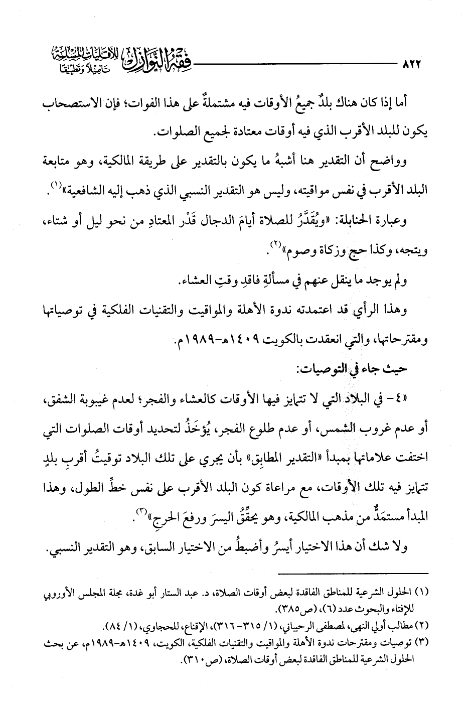 (¬3) توصيات ومقترحات ندوة الأهلة والمواقيت والتقنيات الفلكية، الكويت، 1409 هـ - 1989 م، عن بحث الحلول الشرعية للمناطق الفاقدة لبعض أوقات الصلاة، (ص 310).