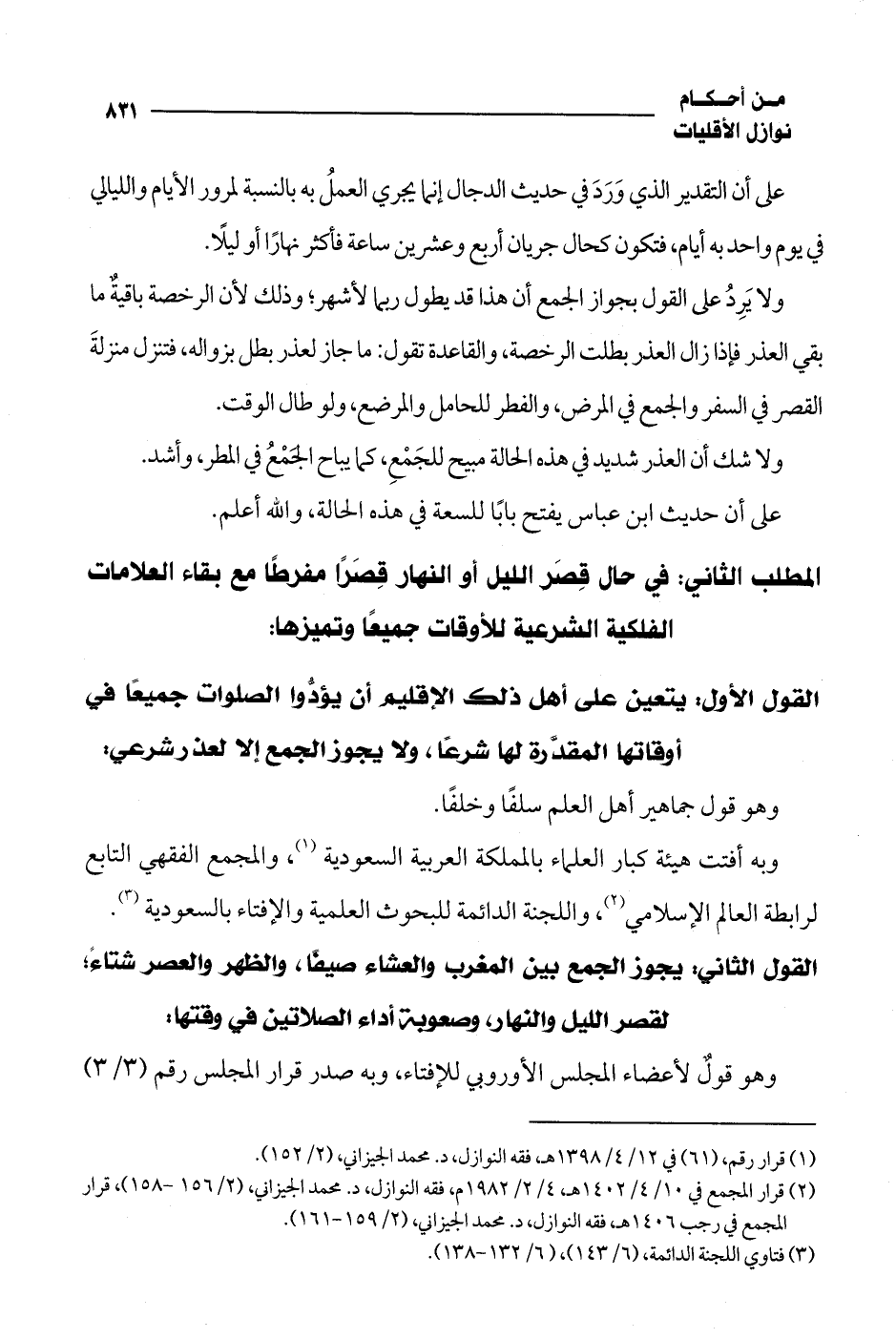القول الأول: يتعين على أهل ذلك الإقليم أن يؤدُّوا الصلوات جميعًا فى أوقاتها المقدًرة لها شرعًا، ولا يجوز الجمع إلا لعذر شرعي: