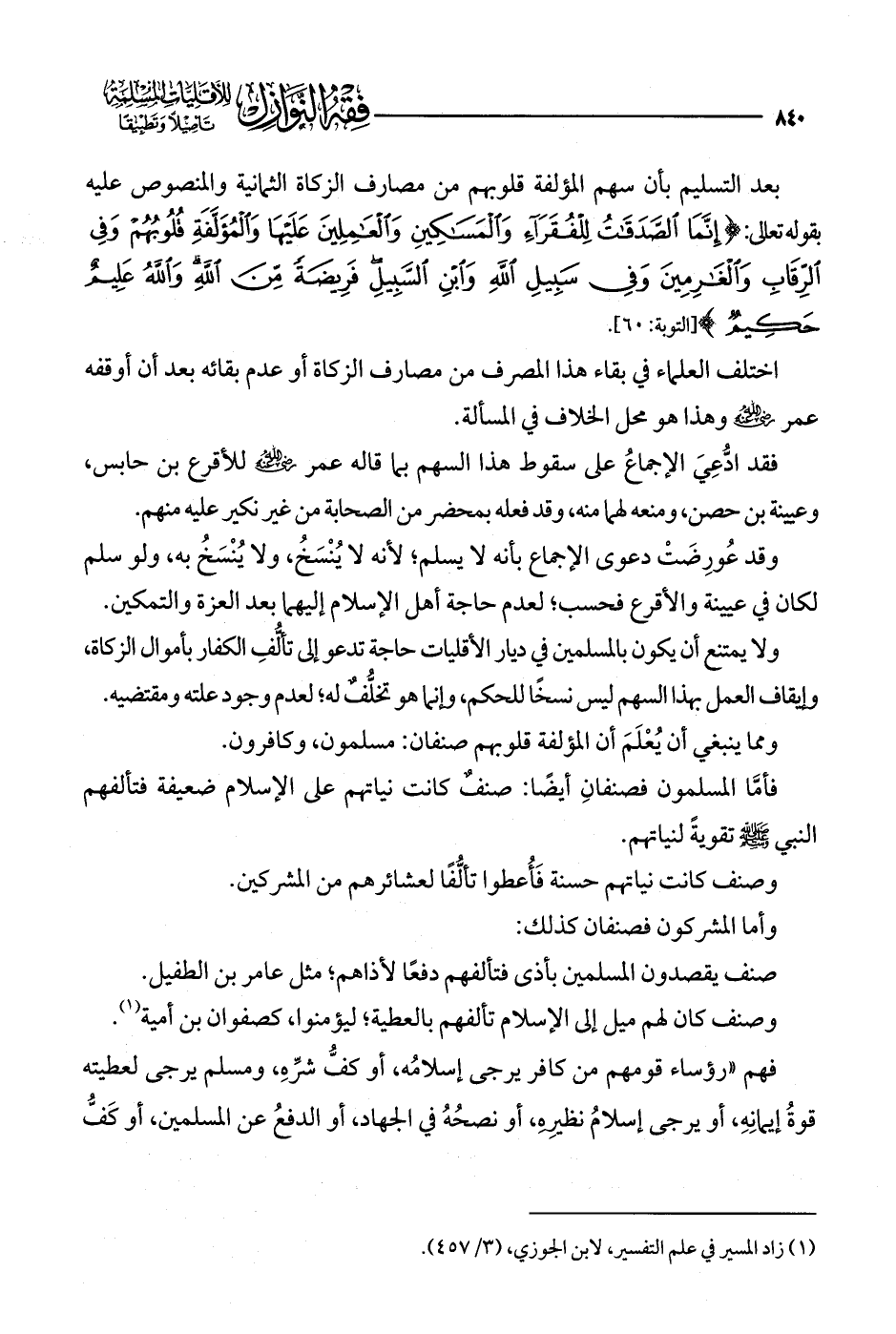 ولا يمتنع أن يكون بالمسلمين في ديار الأقليات حاجة تدعو إلى تألُّفِ الكفار بأموال الزكاة، وإيقاف العمل بهذا السهم ليس نسخًا للحكم، وإنما هو تخلُّفٌ له؛ لعدم وجود علته ومقتضيه.
