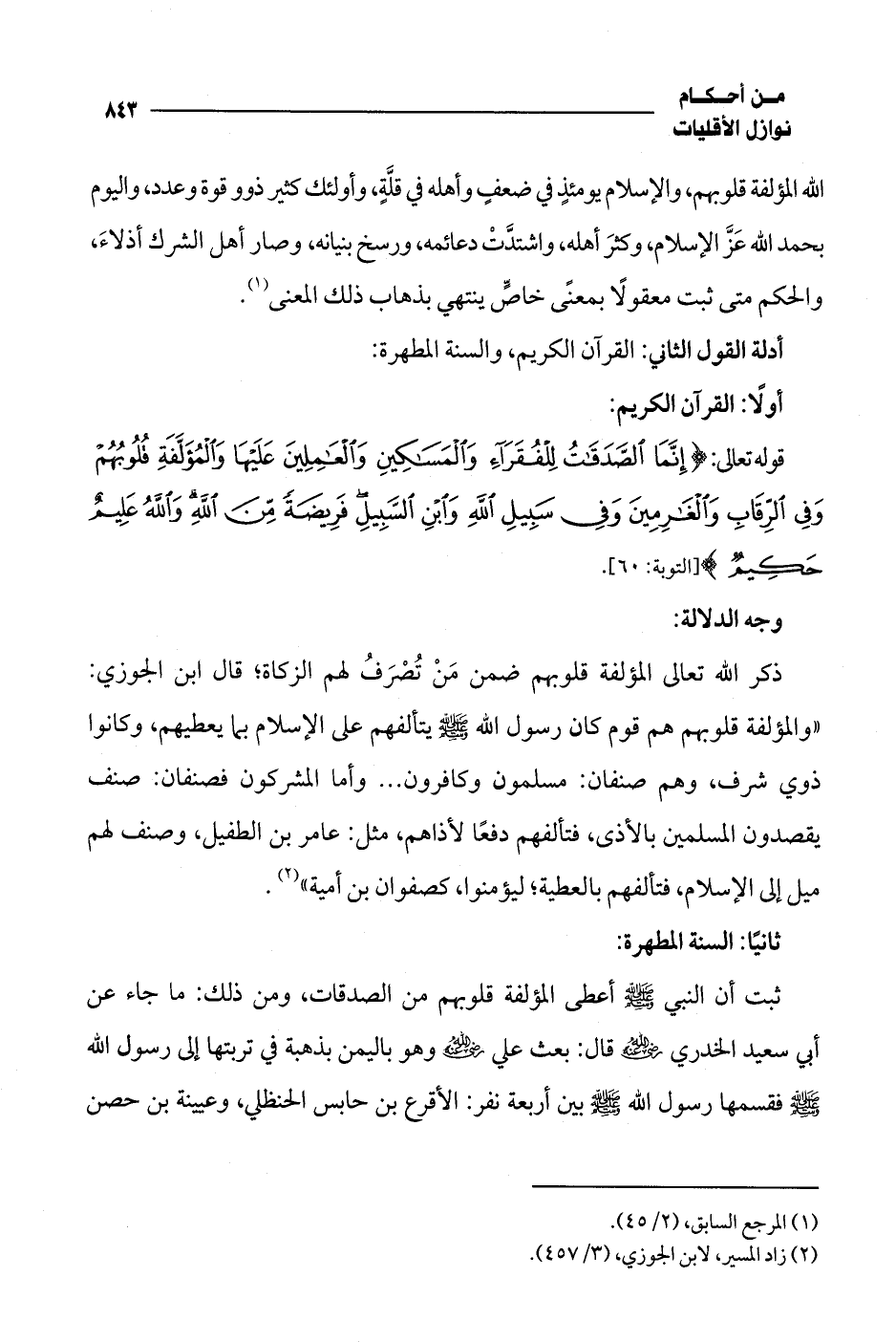 ذكر الله تعالى المؤلفة قلوبهم ضمن مَنْ تُصْرَفُ لهم الزكاة؛ قال ابن الجوزي: "والمؤلفة قلوبهم هم قوم كان رسول الله - صلى الله عليه وسلم - يتألفهم على الإسلام بما يعطيهم، وكانوا ذوي شرف، وهم صنفان: مسلمون وكافرون. . . وأما المشركون فصنفان: صنف يقصدون المسلمين بالأذى، فتألفهم دفعًا لأذاهم، مثل: عامر بن الطفيل، وصنف لهم ميل إلى الإسلام، فتألفهم بالعطية؛ ليؤمنوا، كصفوان بن أمية" (¬2).