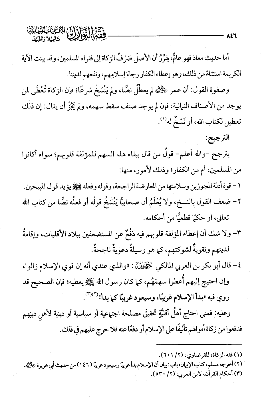 4 - قال أبو بكر بن العربي المالكي -رحمه الله-: "والذي عندي أنه إن قوي الإسلام زالوا، وإن احتيج إليهم أُعطوا سهمَهُم، كما كان رسول الله - صلى الله عليه وسلم - يعطيه؛ فإن الصحيح قد روي فيه "بدأ الإسلام غريبًا، وسيعود غريبًا كما بدأ" (¬2) (¬3).