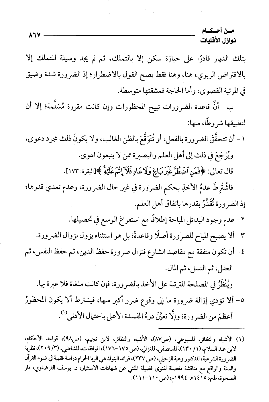 (¬1) الأشباه والنظائر، للسيوطي، (ص 87)، الأشباه والنظائر، لابن نجيم، (ص 98)، قواعد الأحكام، لابن عبد السلام، (1/ 130)، المستصفى، للغزالي، (ص 175 - 176)، الموافقات، للشاطبي، (3/ 209)، نظرية الضرورة الشرعية، للدكتور وهبة الزحيلي، (ص 237)، فوائد البنوك هي الربا الحرام دراسة فقهية في ضوء القرآن والسنة والواقع مع مناقشة مفصلة لفتوى فضيلة المفتي عن شهادات الاستثمار، د. يوسف القرضاوي، دار الصحوة، ط 3، 1415 هـ - 1994 م، (ص 110 - 111).