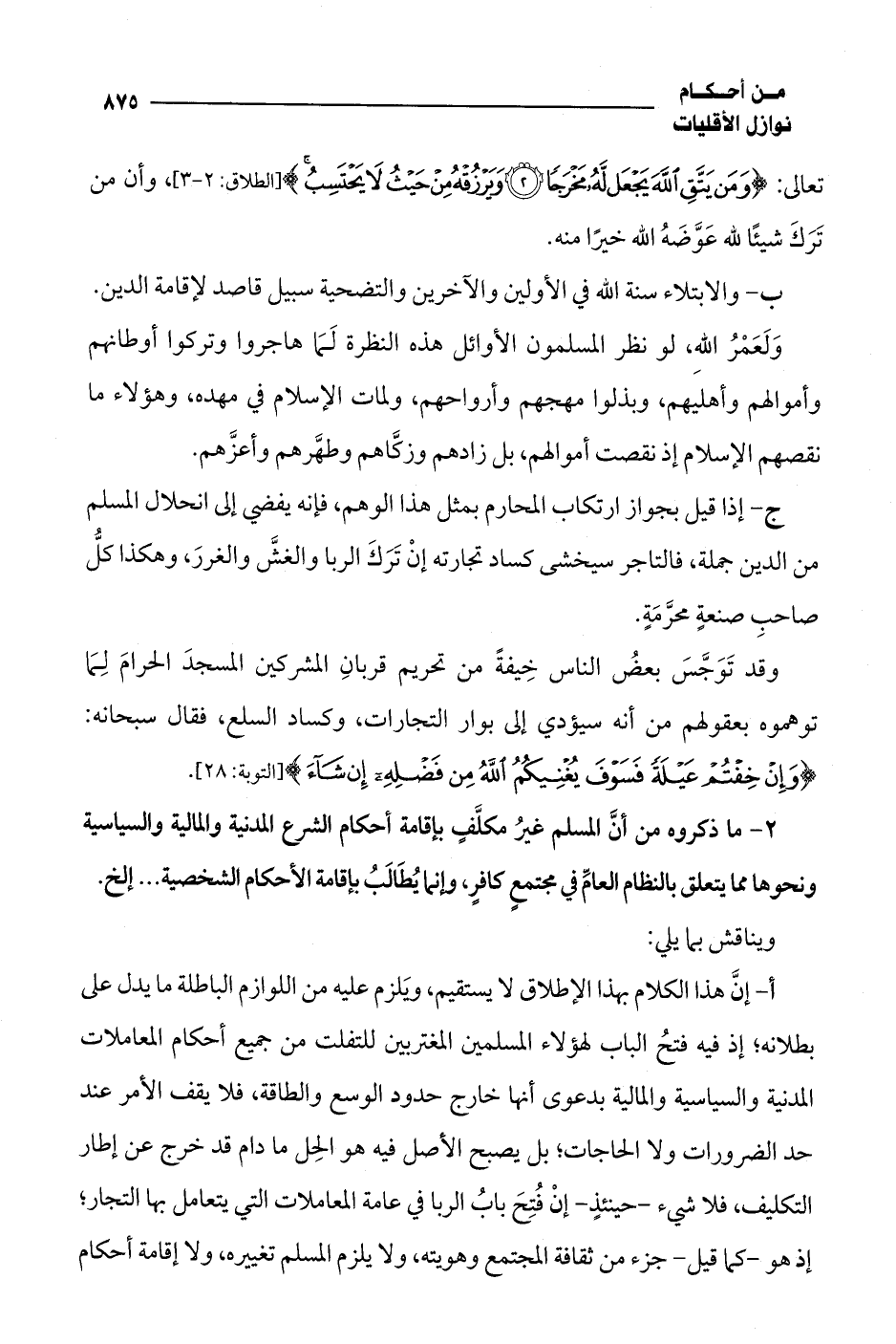 أ - إنَّ هذا الكلام بهذا الإطلاق لا يستقيم، وَيلزم عليه من اللوازم الباطلة ما يدل على بطلانه؛ إذ فيه فتحُ الباب لهؤلاء المسلمين المغتربين للتفلت من جميع أحكام المعاملات المدنية والسياسية والمالية بدعوى أنها خارج حدود الوسع والطاقة، فلا يقف الأمر عند حد الضرورات ولا الحاجات؛ بل يصبح الأصل فيه هو الحِل ما دام قد خرج عن إطار التكليف، فلا شيء -حينئذٍ- إنْ فُتِحَ بابُ الربا في عامة المعاملات التي يتعامل بها التجار؛ إذ هو -كما قيل- جزء من ثقافة المجتمع وهويته، ولا يلزم المسلم تغييره، ولا إقامة أحكام