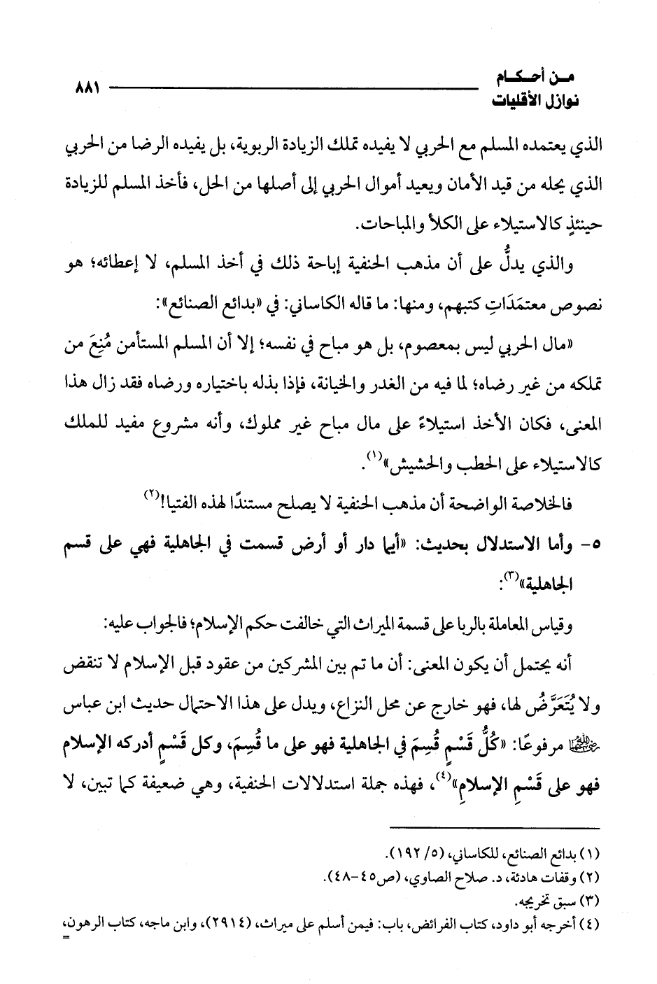 أنه يحتمل أن يكون المعنى: أن ما تم بين المشركين من عقود قبل الإسلام لا تنقض ولا يُتَعَرَّضُ لها، فهو خارج عن محل النزاع، ويدل على هذا الاحتمال حديث ابن عباس -رضي الله عنهما- مرفوعًا: "كُلُّ قَسْمٍ قُسِمَ في الجاهلية فهو على ما قُسِمَ، وكل قَسْمٍ أدركه الإسلام فهو على قَسْمِ الإسلامِ" (¬4)، فهذه جملة استدلالات الحنفية، وهي ضعيفة كما تبين، لا